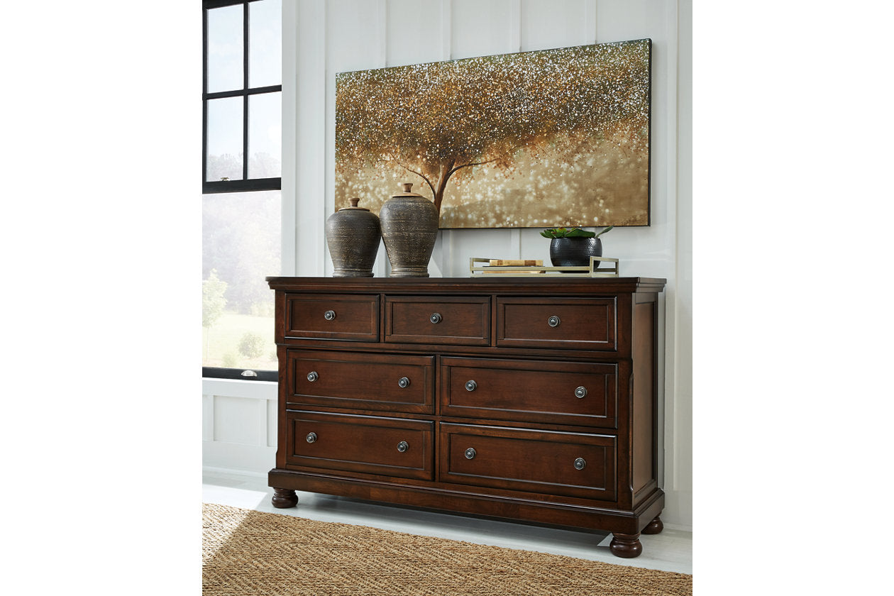 The quality craftsmanship is clear to see. The classic design elements—including inlaid panels, antiqued hardware and bun feet—are easy to love. Satisfying your taste for traditional furnishings, this dresser is elegant without looking fussy. Seven roomy drawers keep your wardrobe organized in style. A hidden pull-out tray behind the top middle drawer puts your small valuables out of sight. — Luna Furniture introduces Porter Dresser to enhance the beauty of your living spaces.