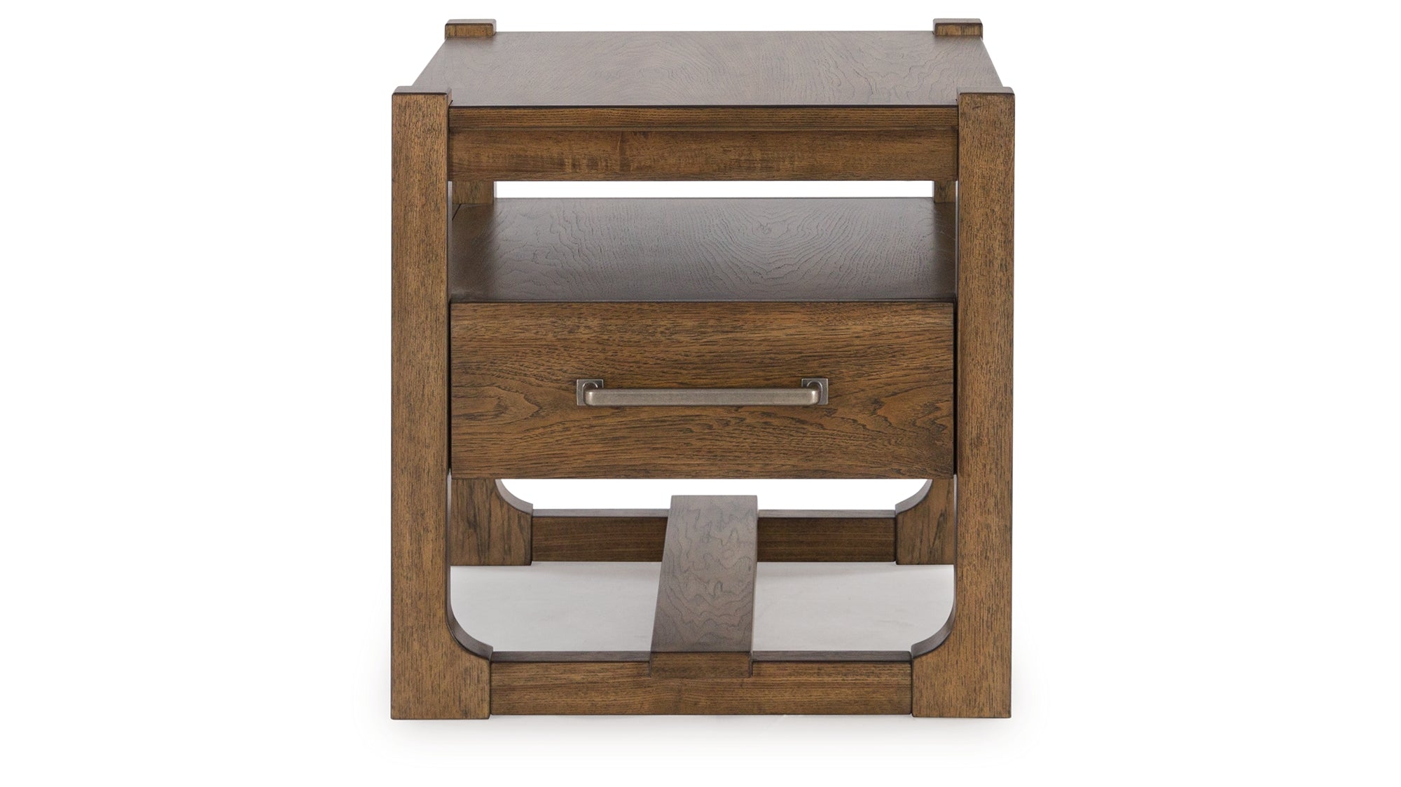 This end table sits comfortably at the intersection of modern lodge and farmhouse aesthetics. Your warm and welcoming disposition is reflected in the charming architectural elements and light brown glazed finish. Even with its poise, this table remains practical. A drawer and unique open shelf design encourage you to store and display in style. — Luna Furniture introduces Cabalynn End Table to enhance the beauty of your living spaces.