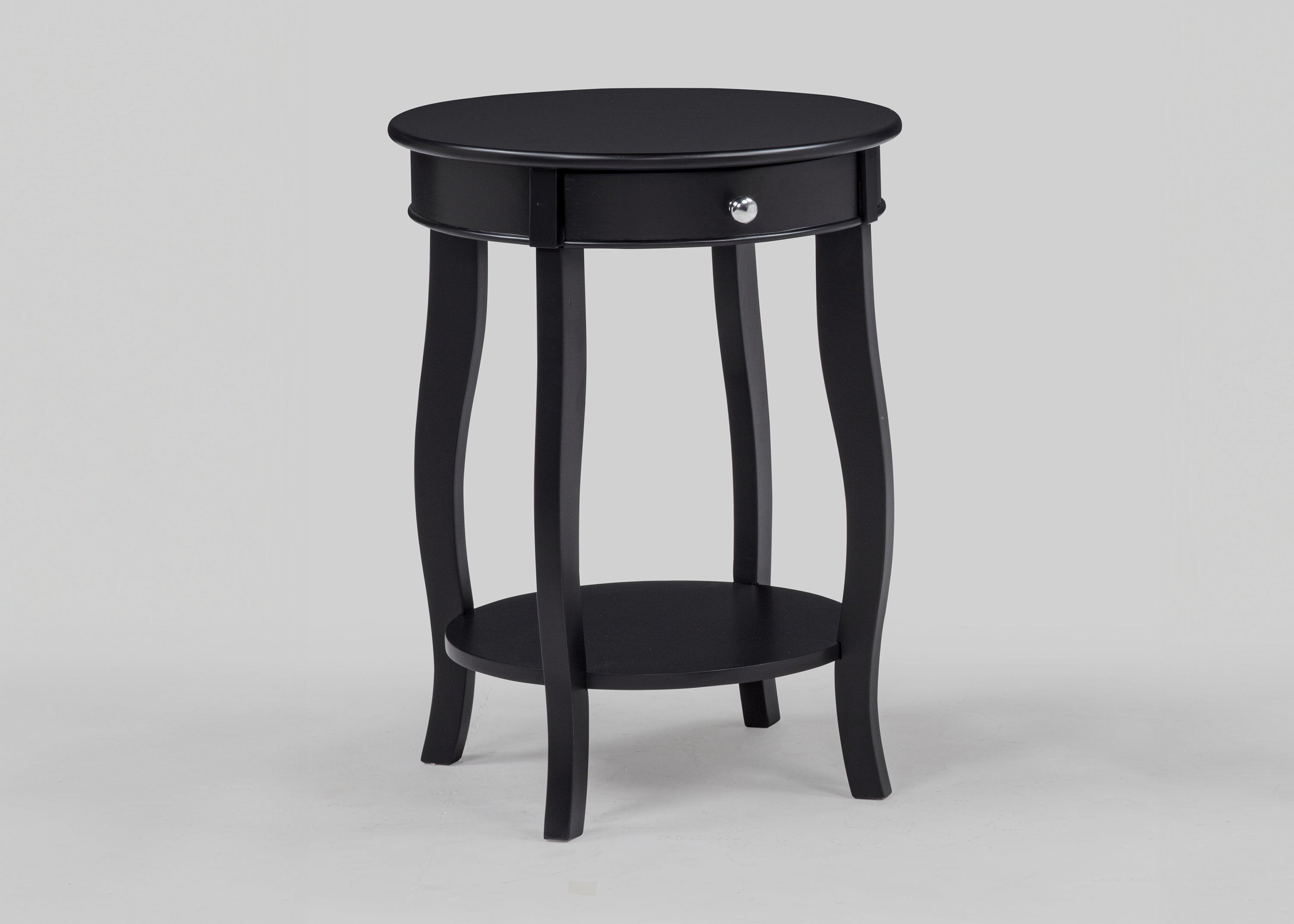 Transform your living room or reading nook into a haven of comfort and style with the Jacie Black Chairside Round End Table by Crown Mark. Picture yourself relaxing on your favorite chair with a cup of coffee and your latest read easily within reach, thanks to the perfect placement of this elegant end table. The sleek black finish creates an air of timeless sophistication, while the smoothly curved legs and round silhouette inject a modern note that blends seamlessly with a variety of home decor styles—from minimalist urban lofts to cozy transitional family rooms. With its versatile compact form, this table is at home next to your sofa, tucked into a corner, or serving as a bedside accent. The upper drawer offers a handy spot for stashing remotes, reading glasses, or personal essentials, while the spacious open shelf provides ample room for decorative displays or extra storage. Built with quality craftsmanship and an eye for refined aesthetics, the Jacie Black Chairside Round End Table is more than just a functional piece—it’s a subtle statement of style and versatility. Luna Furniture introduces Jacie Black Chairside Round End Table to enhance the beauty of your living spaces.