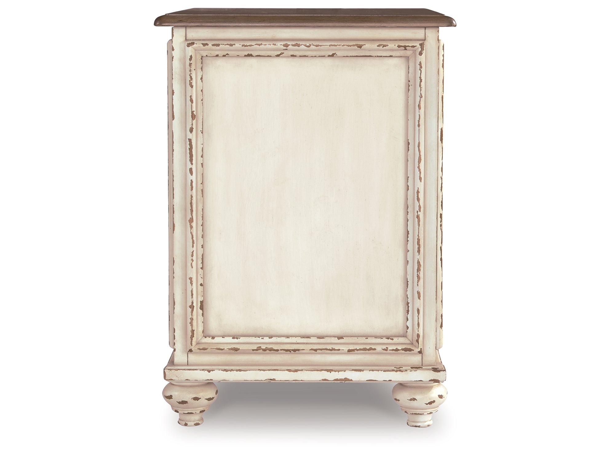 Elevating the art of traditional cottage styling, this chairside end table is sure to serve you beautifully for years to come. Antiqued two-tone aesthetic blends a chipped white with a distressed wood finished top for added charm. Cabinet door features inset mirror with filigree moulding for a fanciful twist. — Luna Furniture introduces Realyn Chairside End Table to enhance the beauty of your living spaces.