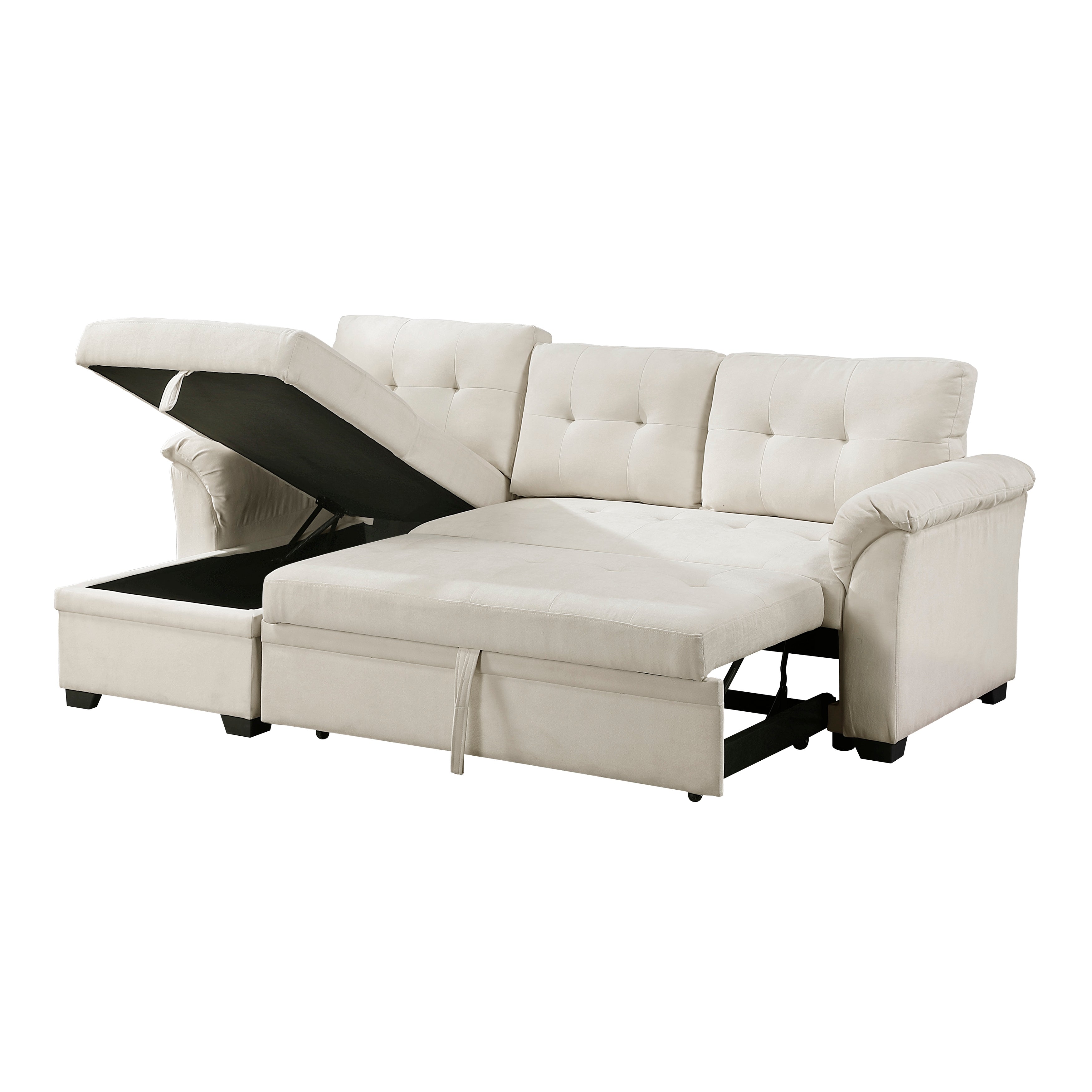 This versatile reversible sleeper sectional sofa is the perfect solution for maximizing space and comfort in any living area, apartment, or den. Crafted with a durable plywood frame and upholstered in a soft, textured fabric, this stylish and functional sofa offers plush foam padding over pocket coils for exceptional support whether you're sitting or sleeping. The innovative design includes a chaise with convenient hidden storage and a 2-seater featuring a pull-out bed, making it ideal for overnight guests. Plus, the integrated drop-down cup holders add an extra touch of convenience for movie nights or casual entertaining, all while its tufted details and reversible configuration allow for seamless integration into various room layouts and styles.
