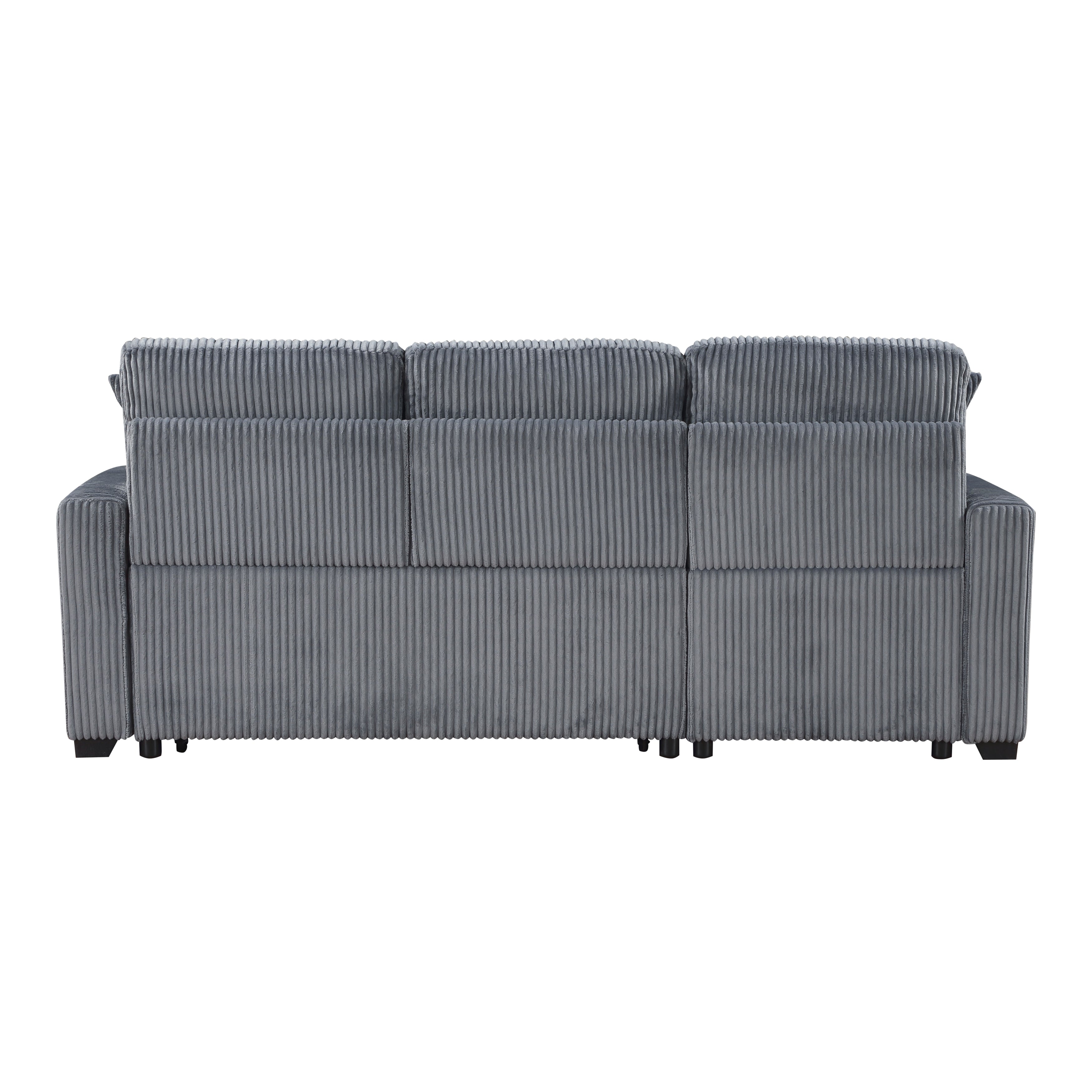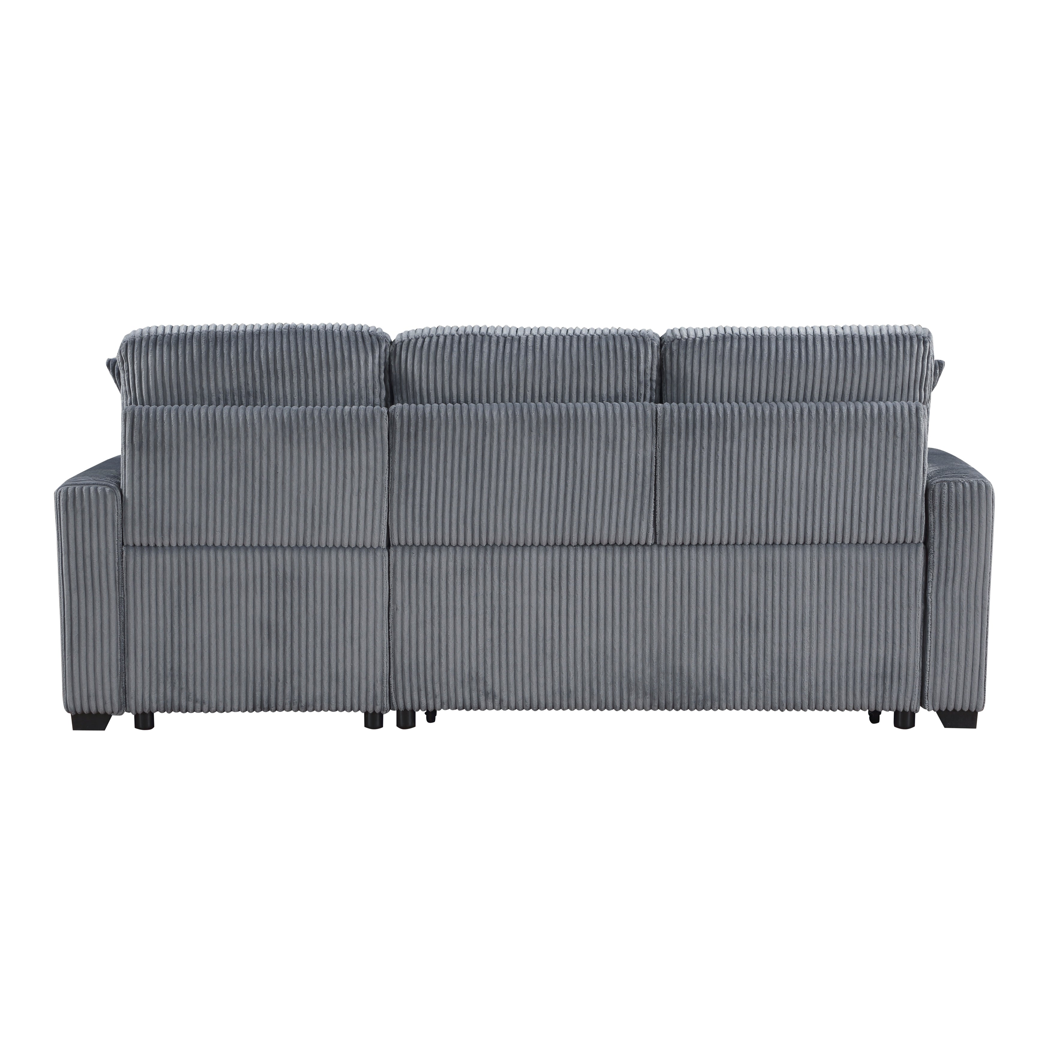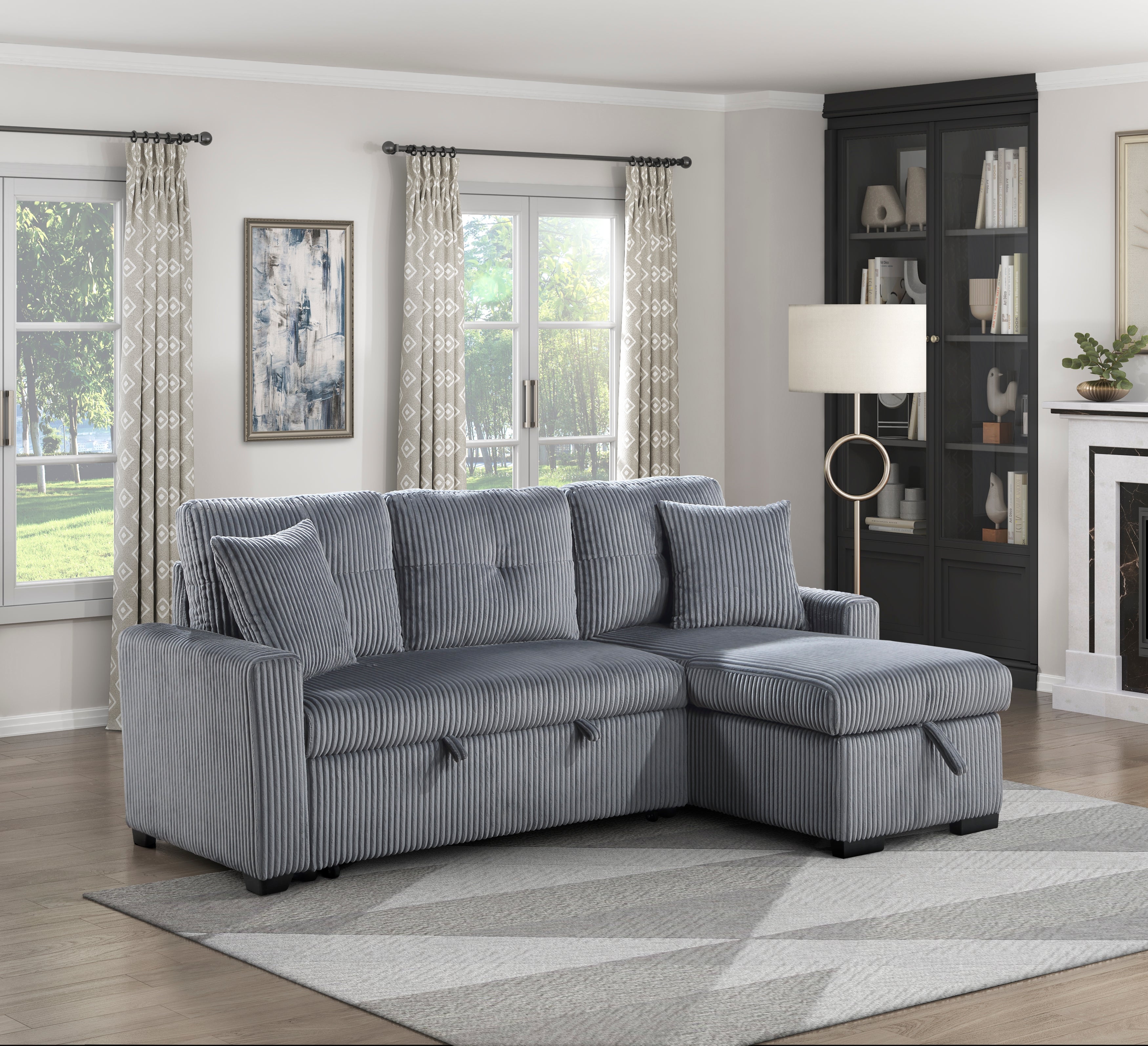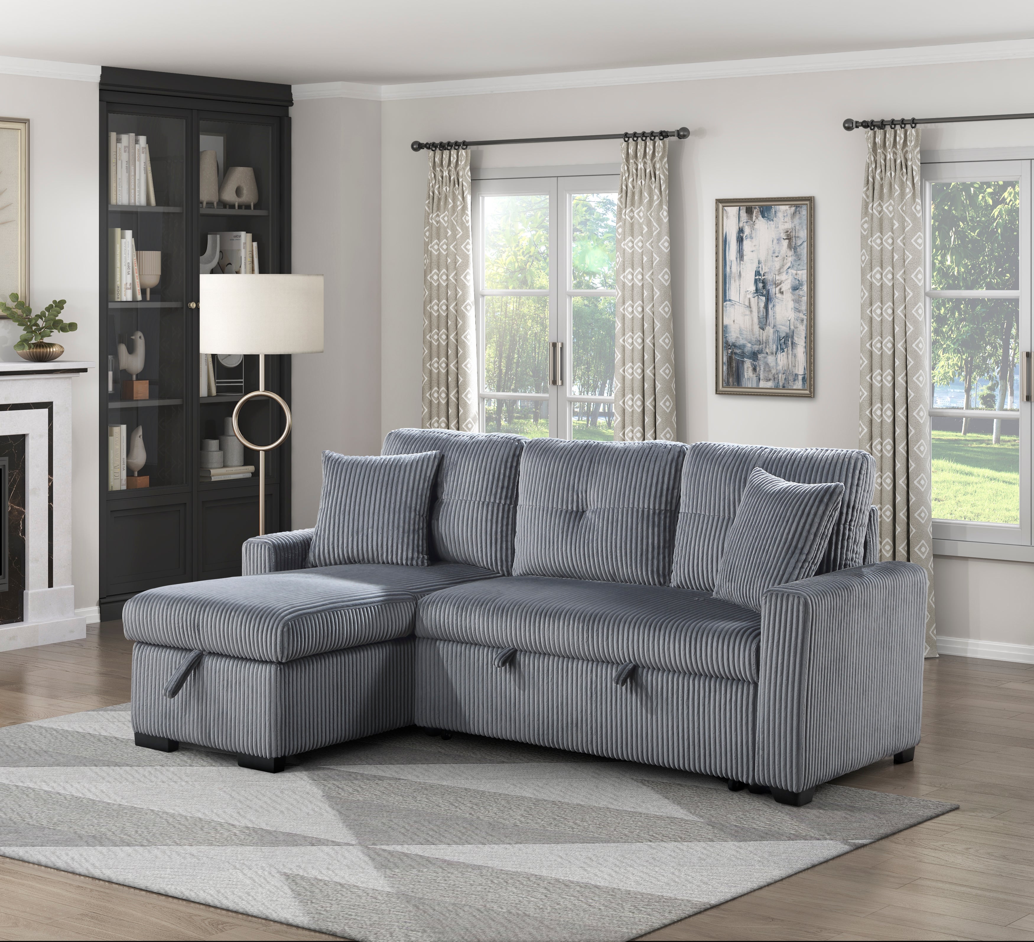Whether seated or laying down, the design of the Rhett Collection utilizes hidden storage, and convertibility to achieve a welcome spot for relaxation. The reversible configuration of the three-seat sectional creates the option of a left or right chaise placement for a perfect fit within your casual living room. The pull-out bed that is stored beneath the two-seat unit of the sofa, pops up to match length with the storage chaise creating ample space for full leg extension. The lift-top seat of the chaise opens to reveal hidden storage perfect for blankets and pillows. Plush corduroy upholstery covers the collection, its dark gray tone a neutral complement to your space.
