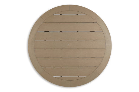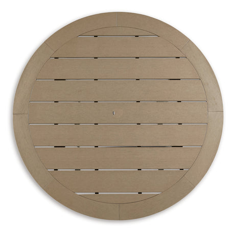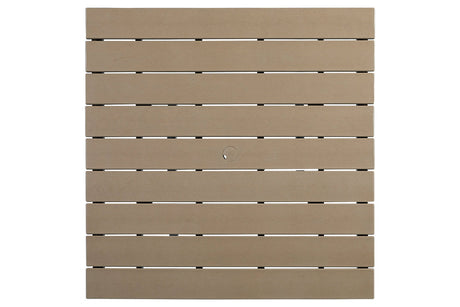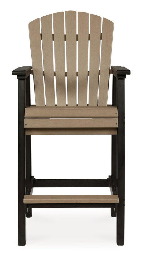 The Fairen Trail collection by Ashley Furniture is an outdoor furniture set designed for durability and style. It features a two-tone driftwood and black finish with a slatted design that allows rainwater to pass through easily. The collection includes bar stools, a bar table, counter-height stools, and a counter-height dining table.