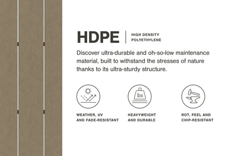 The pieces are made from MEGA TUFF™ HDPE material, a high-density polyethylene that gives the look of wood with the weather resistance of plastic. The stainless steel hardware adds to the durability of the set.