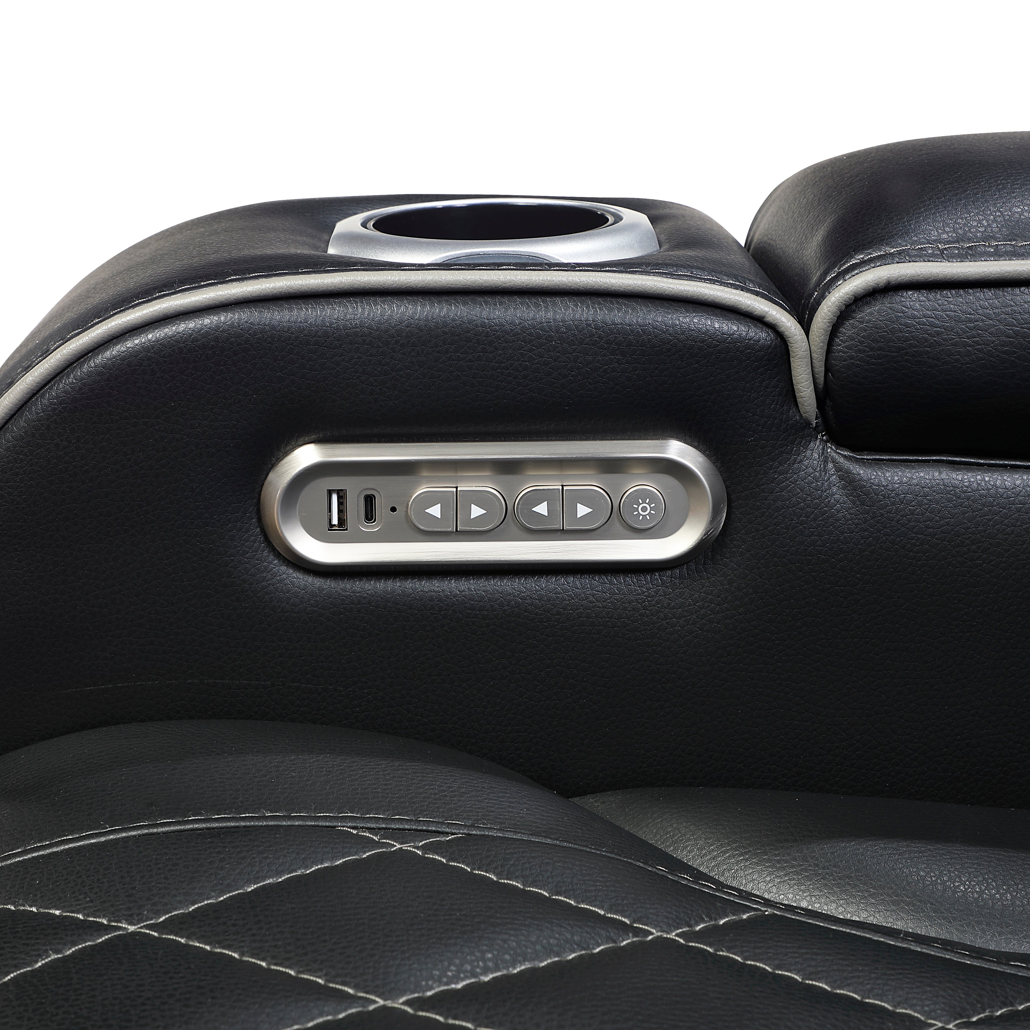Experience unparalleled comfort and convenience with this black faux leather power double reclining loveseat. This luxurious loveseat is designed for ultimate relaxation with features like independent power reclining, adjustable power headrests, and ambient LED lighting. The center console provides storage and cup holders for added convenience, while built-in USB ports keep your devices charged. Top and side storage arms offer additional storage space for remotes or other essentials. The sleek black faux leather upholstery with diamond-stitched detailing adds a touch of modern sophistication, making this loveseat a perfect centerpiece for your home theater or living room.