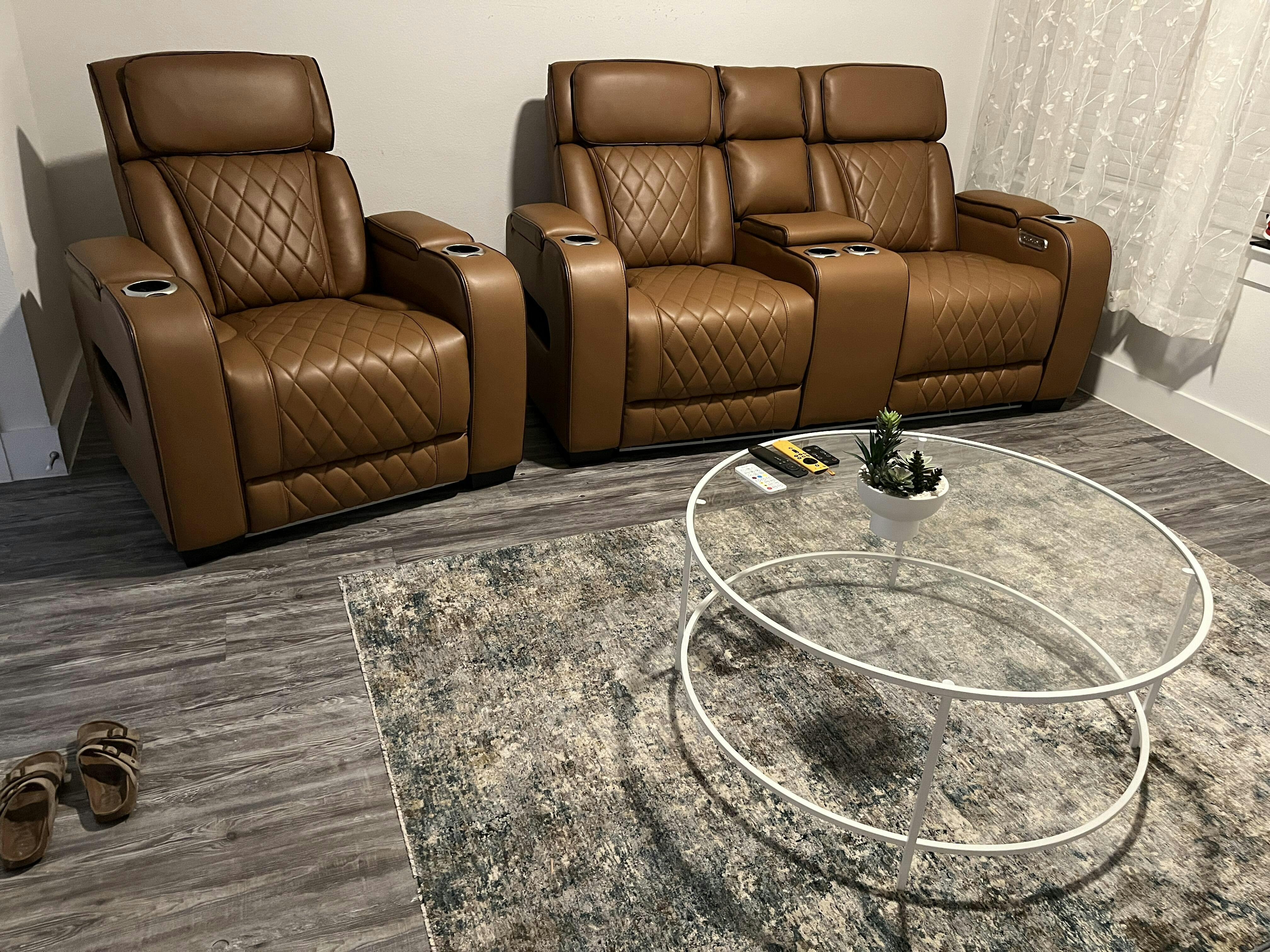 Experience the ultimate in relaxation and convenience with this tan faux leather power reclining chair. Designed to provide unparalleled comfort, this chair features power reclining, an adjustable power headrest, and ambient LED lighting. Enjoy your favorite beverages with built-in cup holders, keep your devices charged with USB ports, and store essentials in the top and side storage arms. The warm tan faux leather upholstery with diamond-stitched detailing adds a touch of modern sophistication, making this recliner a perfect addition to your home theater, living room, or personal relaxation space.