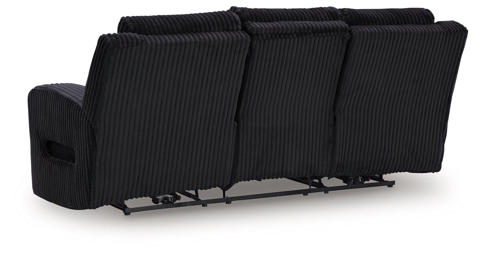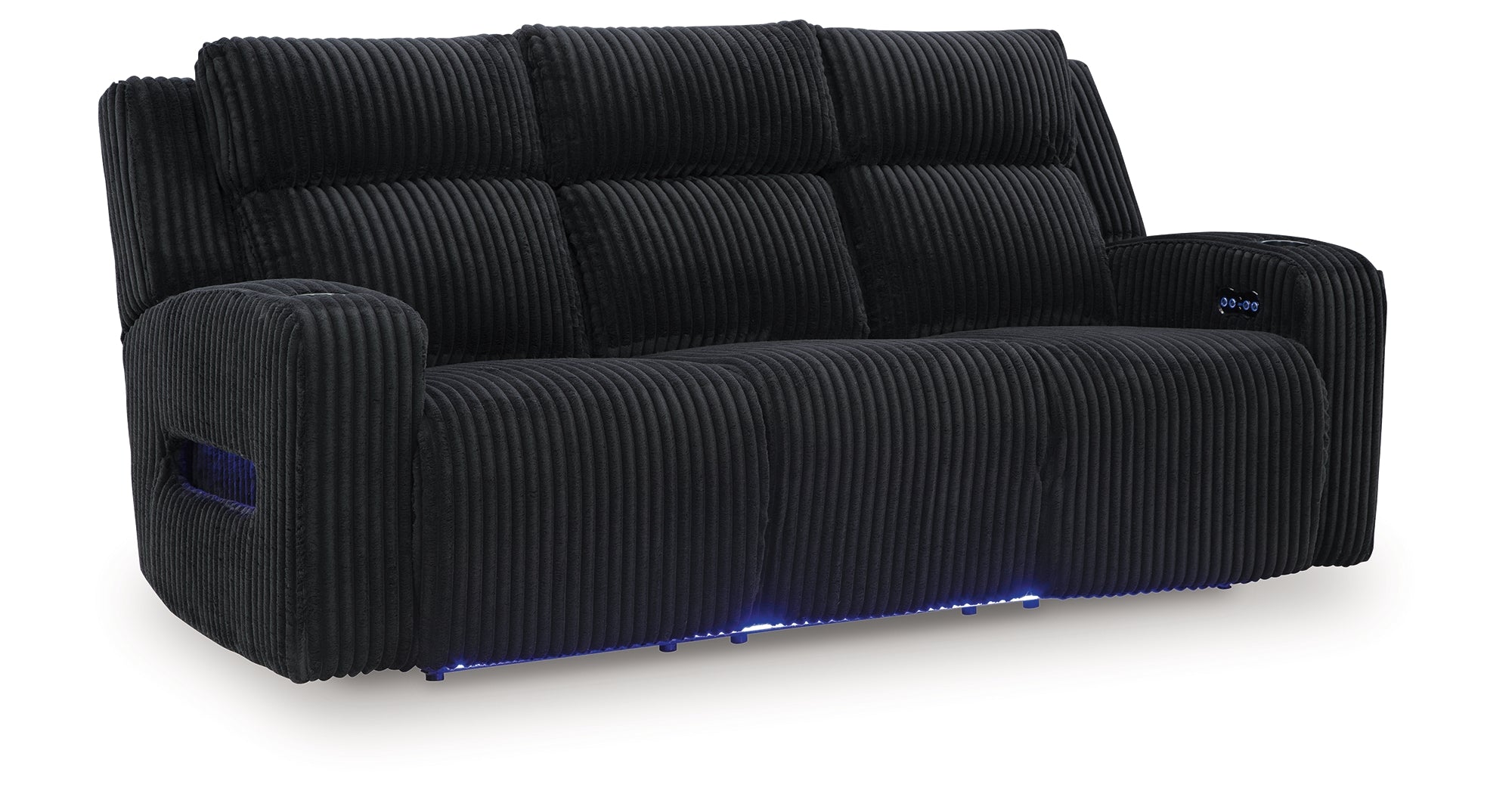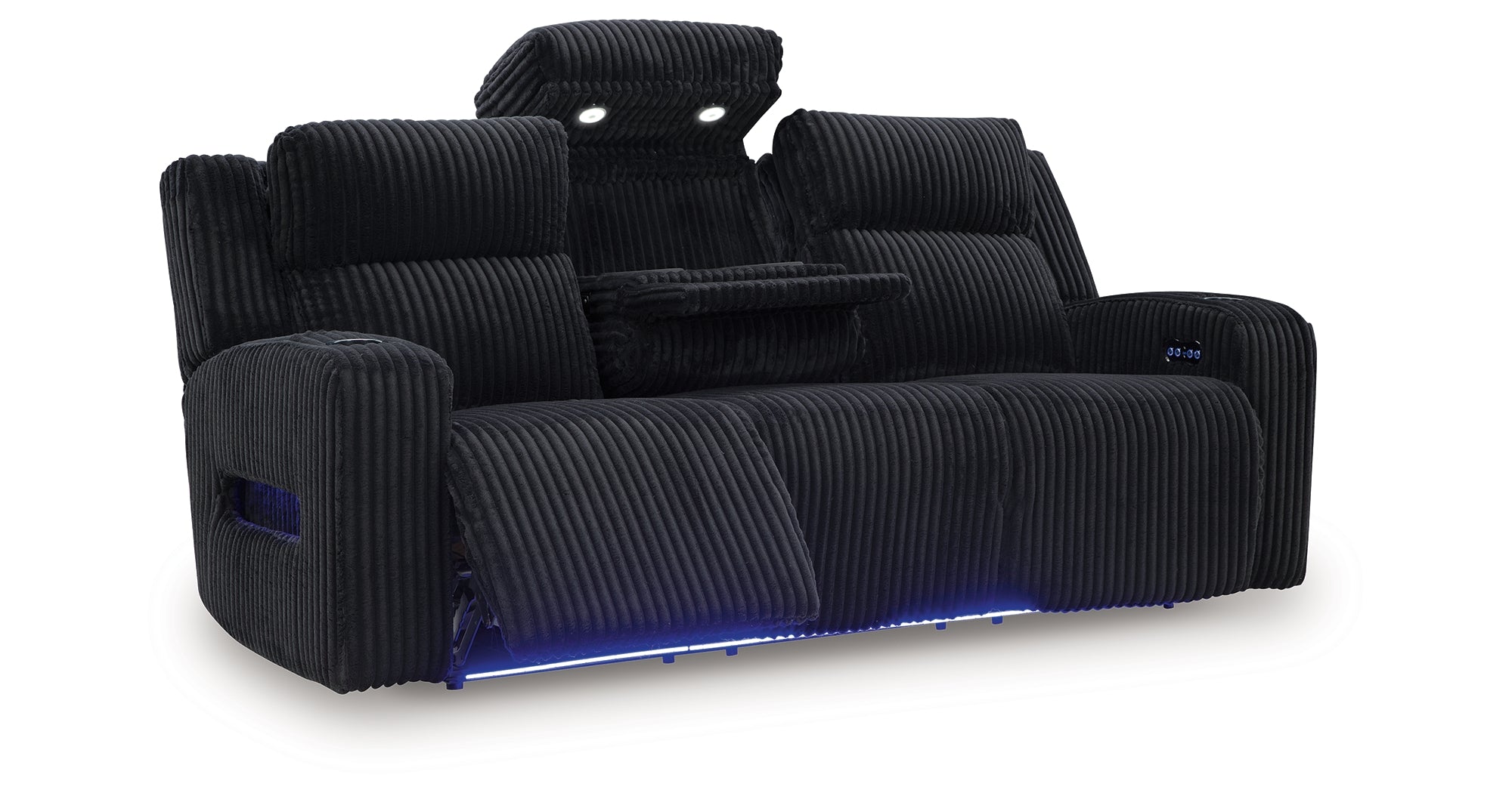 Trend-right style, meet irresistible modern function. Your living room gets a cozy-cool upgrade with this power reclining sofa. Curl up in its ultra-chic corded upholstery and recline with one-touch controls. Is it movie night or game time? With ambient LED lighting and wireless audio connectivity, this sofa transforms from a serene relaxation spot to an entertainment hub. Its drop-down table, USB charging and cup holders make lounging all the more convenient.