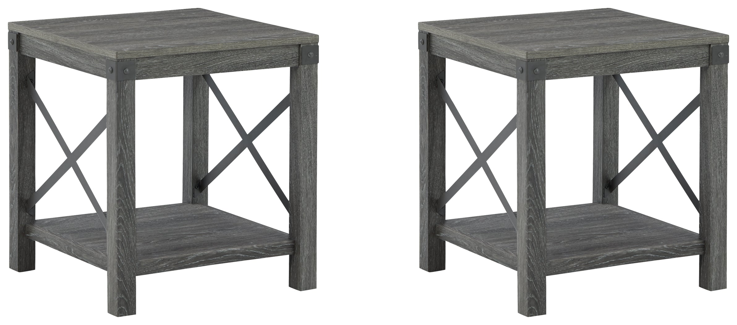 Open the door to modern farmhouse style with this square end table set. The beautiful woodgrain look and classic crossbuck metal accents are a cool touch, while the lower shelf provides surface space for fashionable home accessories.