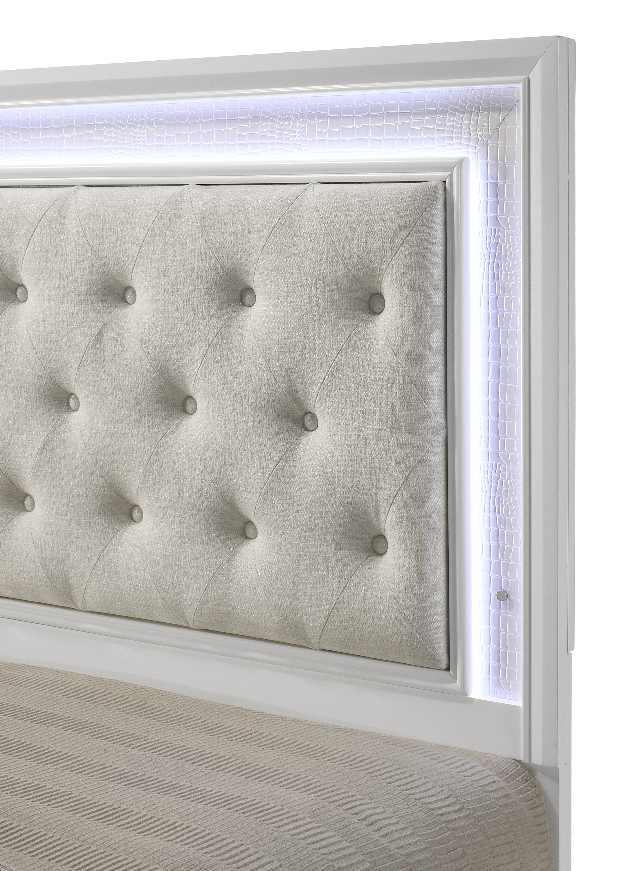 Awaken a new level of sophistication and comfort in your bedroom with the Lyssa Oat and Frost Full LED Upholstered Panel Bed by Crown Mark. Perfect for those who desire more than just a place to sleep, this bed instantly elevates your interior with its blend of contemporary design and cutting-edge functionality. Picture coming home after a long day to a softly glowing, tufted headboard in a tranquil oat and frost palette—an oasis of relaxation. The embossed crocodile pattern and silver champagne finish convey a refined, high-end ambiance set to impress guests and delight your senses, while the built-in LED backlighting creates a cozy, ambient glow ideal for reading or winding down. Designed with both aesthetic appeal and robust construction in mind, the Lyssa bed effortlessly anchors your modern home decor, merging glamour with everyday comfort. Luna Furniture introduces Lyssa Oat and Frost Full LED Upholstered Panel Bed to enhance the beauty of your living spaces.