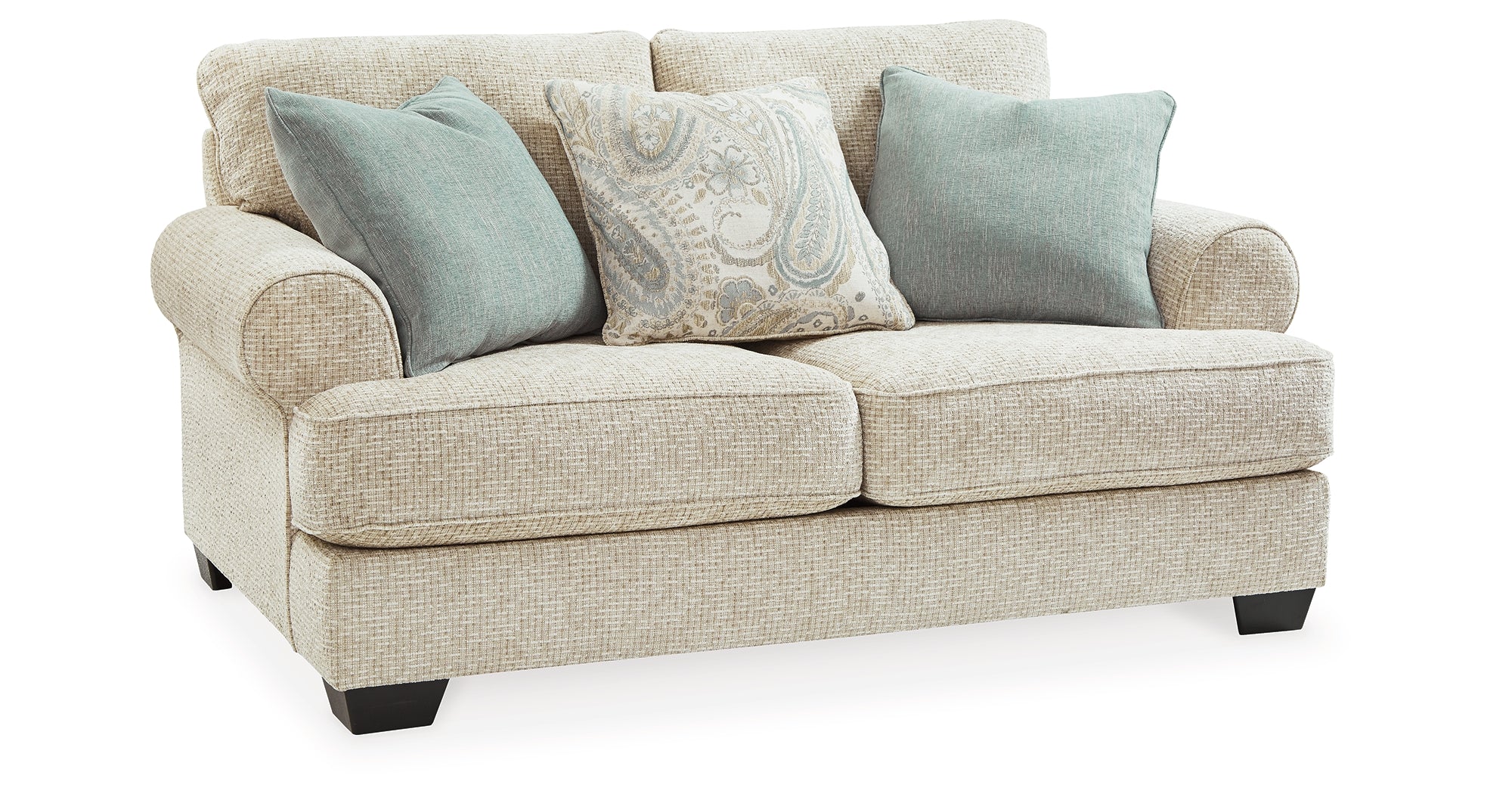 This sofa and loveseat strike a beautiful balance between classic and current. Traditional elements include t-cushion seating and setback roll arms, angled for modern flair. Posh collection of pillows in spa mist and jacquard paisley make a muted, mellow complement to the sofa’s casual textured chenille upholstery. Choice of sandstone beige is a light and lovely style awakening.