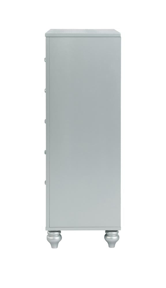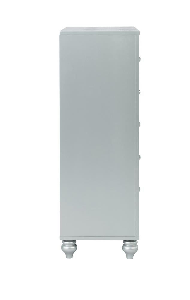 Enhance your home with a modern glam update to a classic design with this transitional five-drawer chest. It boasts a dazzling design that takes lends glitz to any modern bedroom. It comes in a vibrant silver metallic finish with fret work detail on the front panels and drawer fronts. The drawers are adorned with crystal-like pulls and the top ones are lined with black felt to protect treasured valuables. Delicate bun feet complete the design of this exquisite masterpiece.