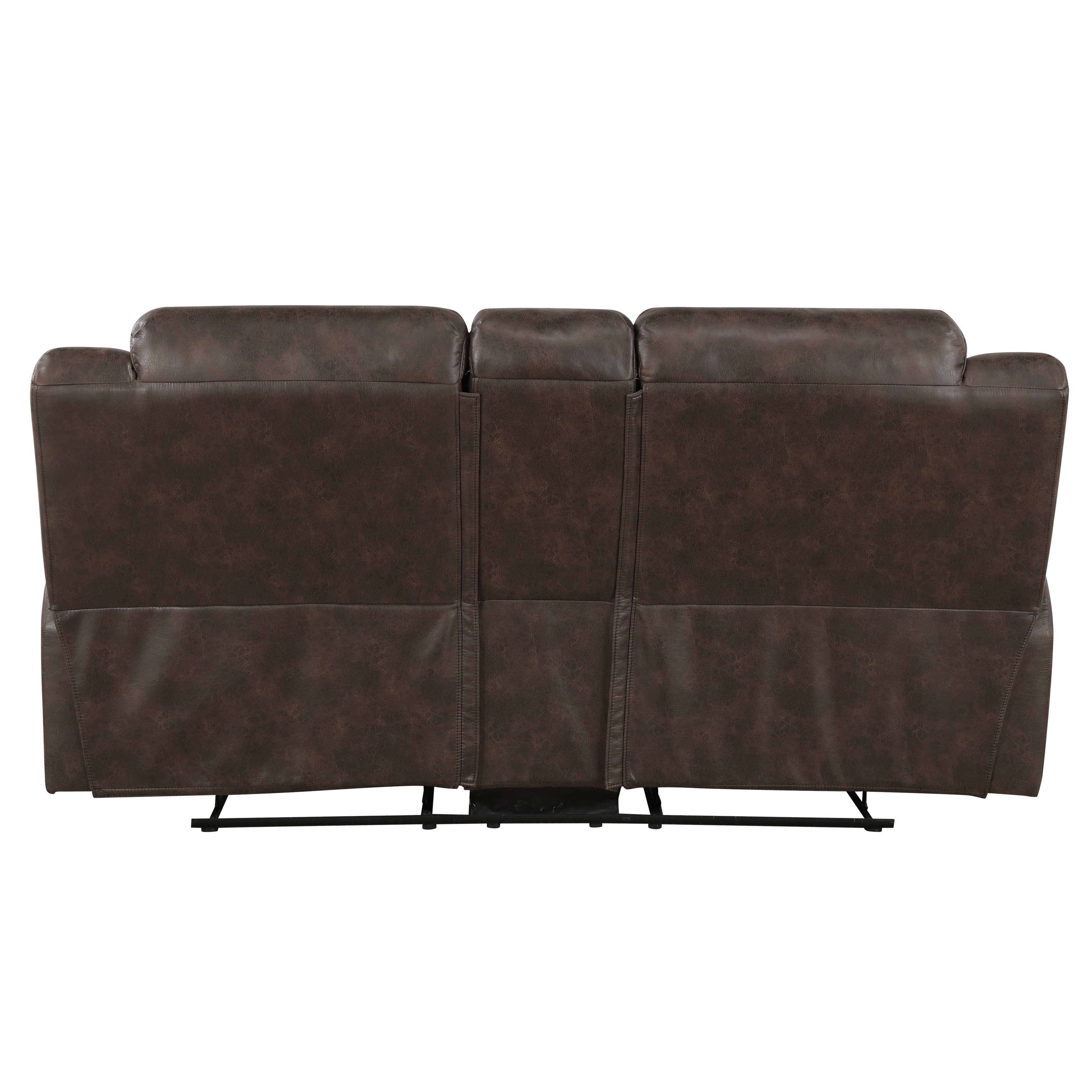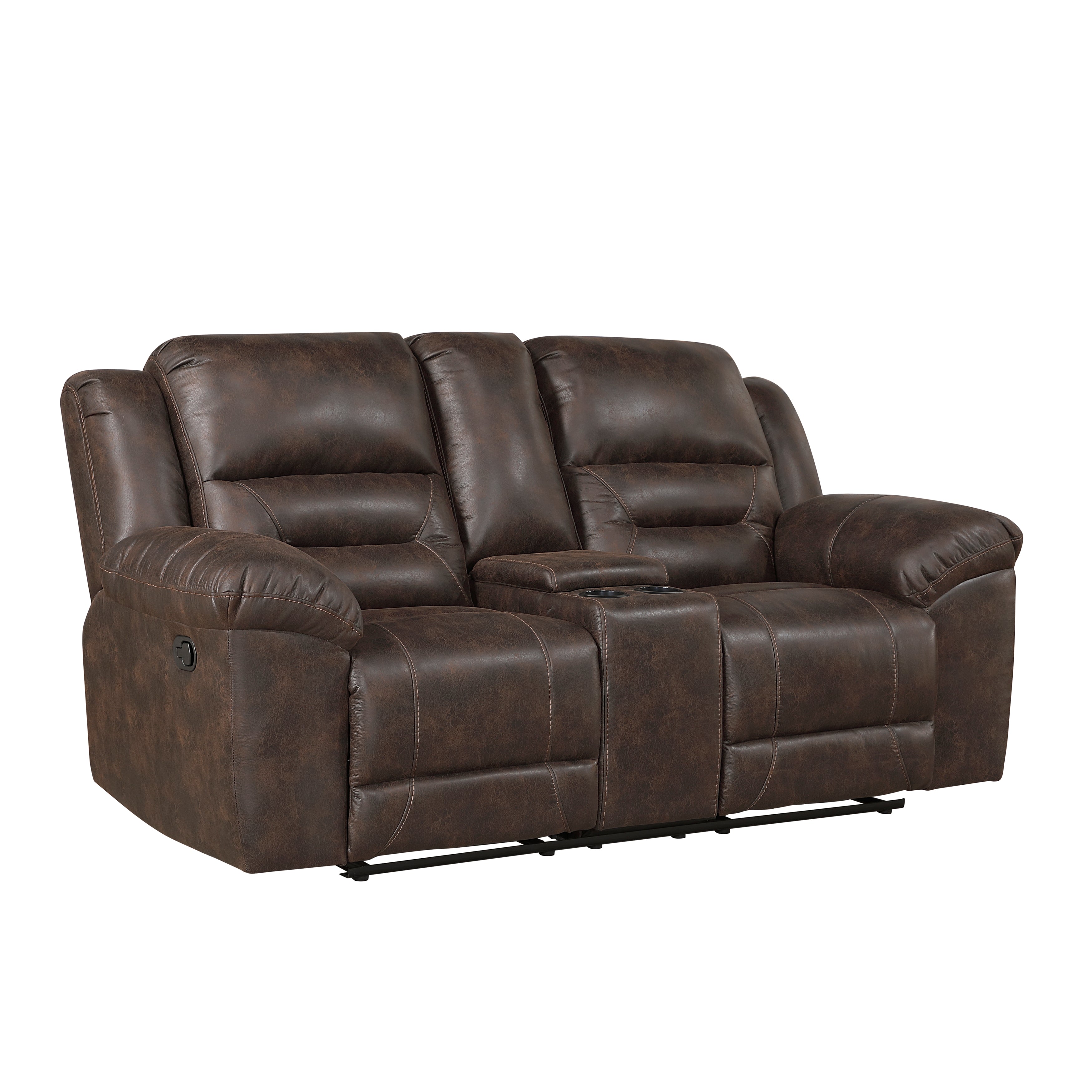 The Hazen Collection’s versatile style and functional design will be an inviting addition to your home’s living room. Dual end recliners are featured on love seat, with its center console providing secure storage of beverages via the two cupholders and a lift-top storage compartment. The reclining mechanisms of the love seat are engaged with a pull of their side mounted tabs, taking you from seated to prone in an easy motion. Dark brown polished microfiber upholstery covers the plush pillow-top arms and contoured seating, creating a perfect combination ready for relaxation.