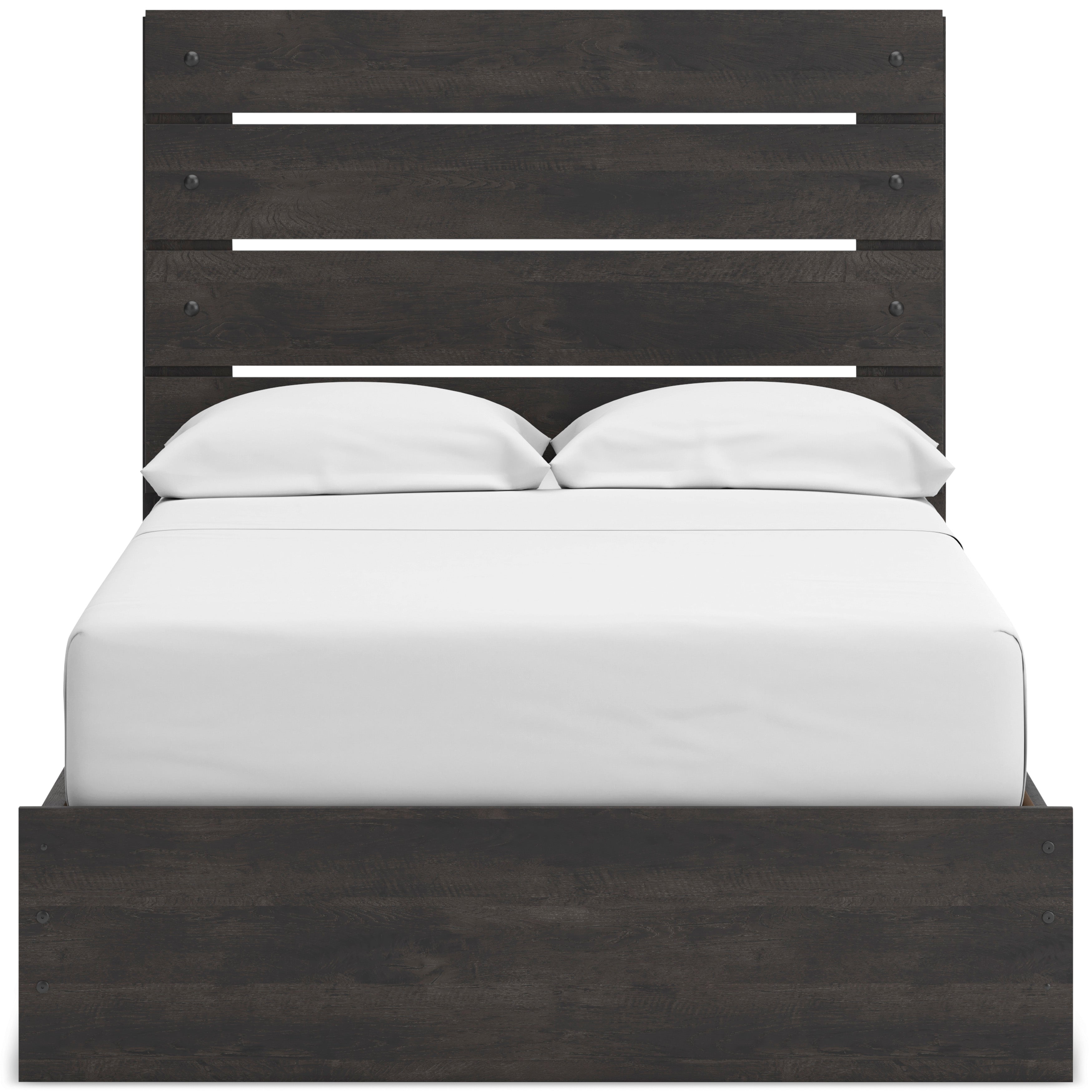 Includes panel headboard/footboard, side storage with rails, panel rails and roll slats