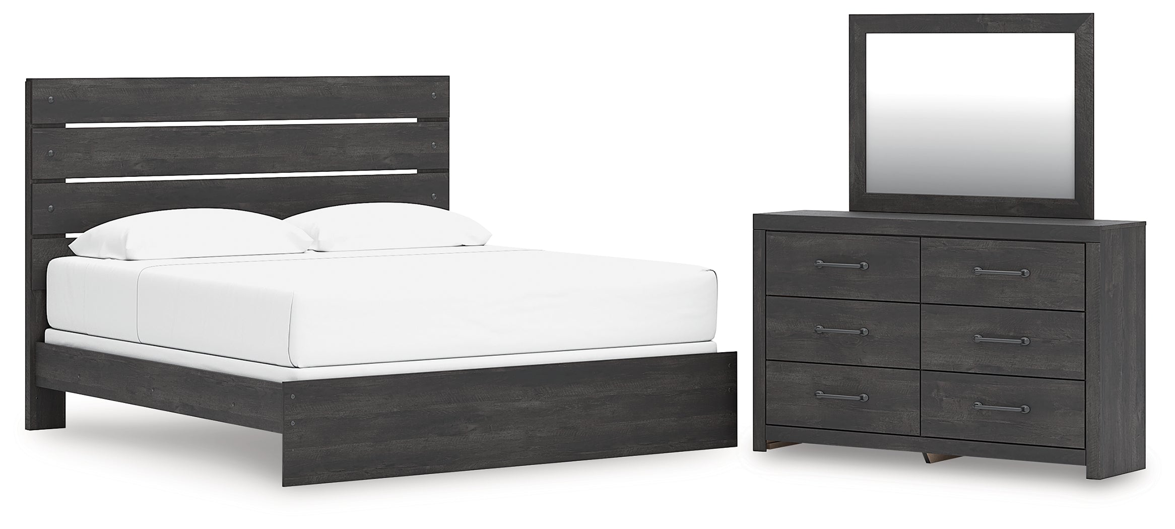Hollivern King Panel Bed with Mirrored Dresser in Dark Gray