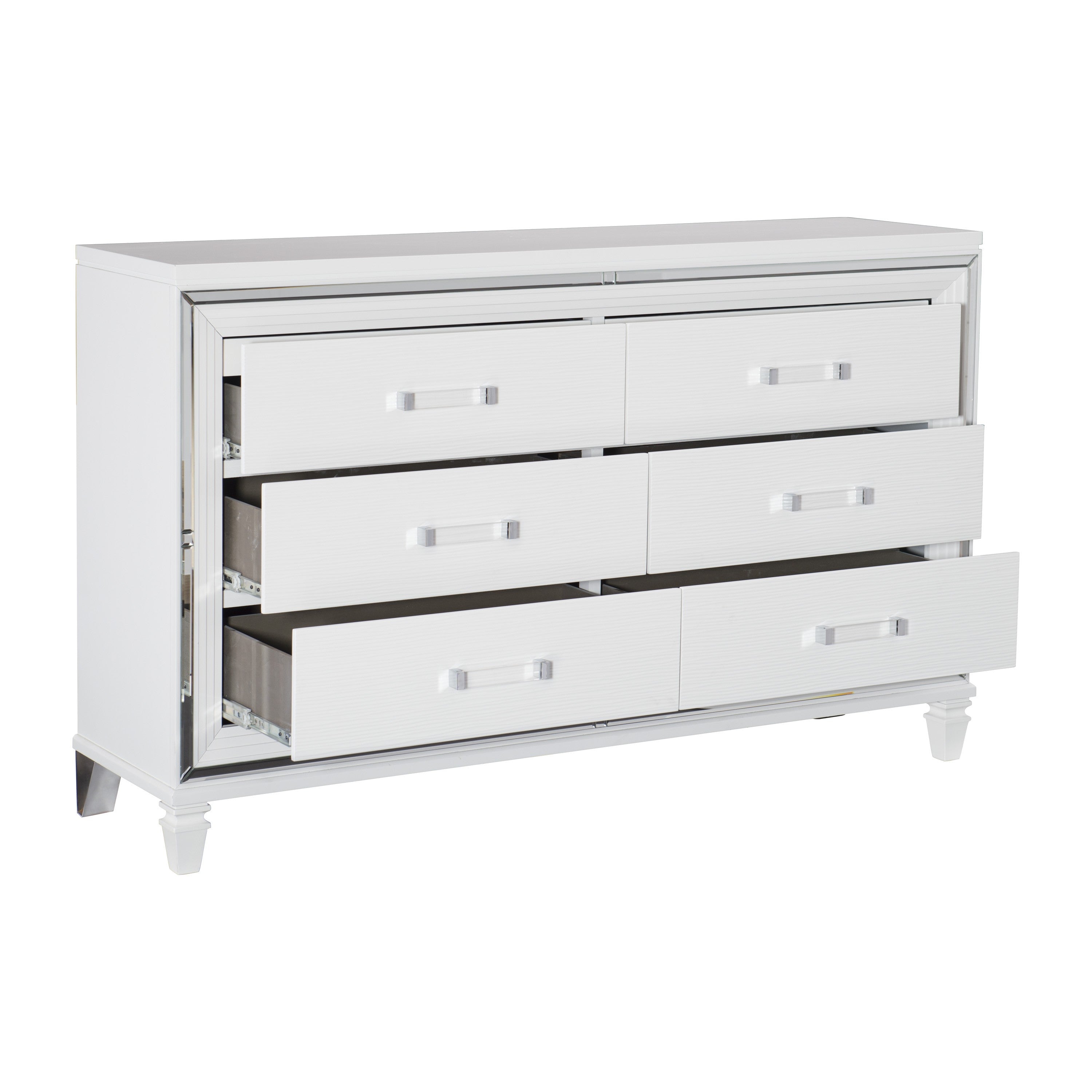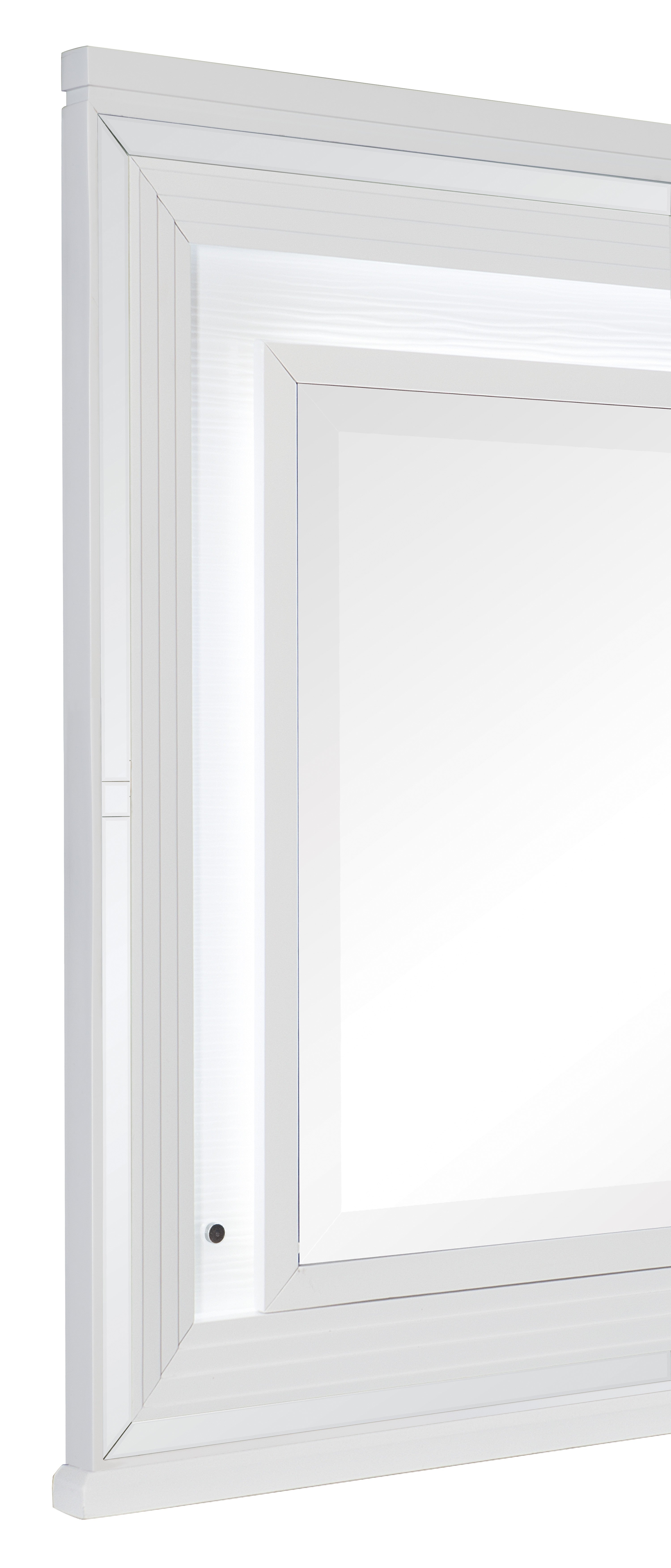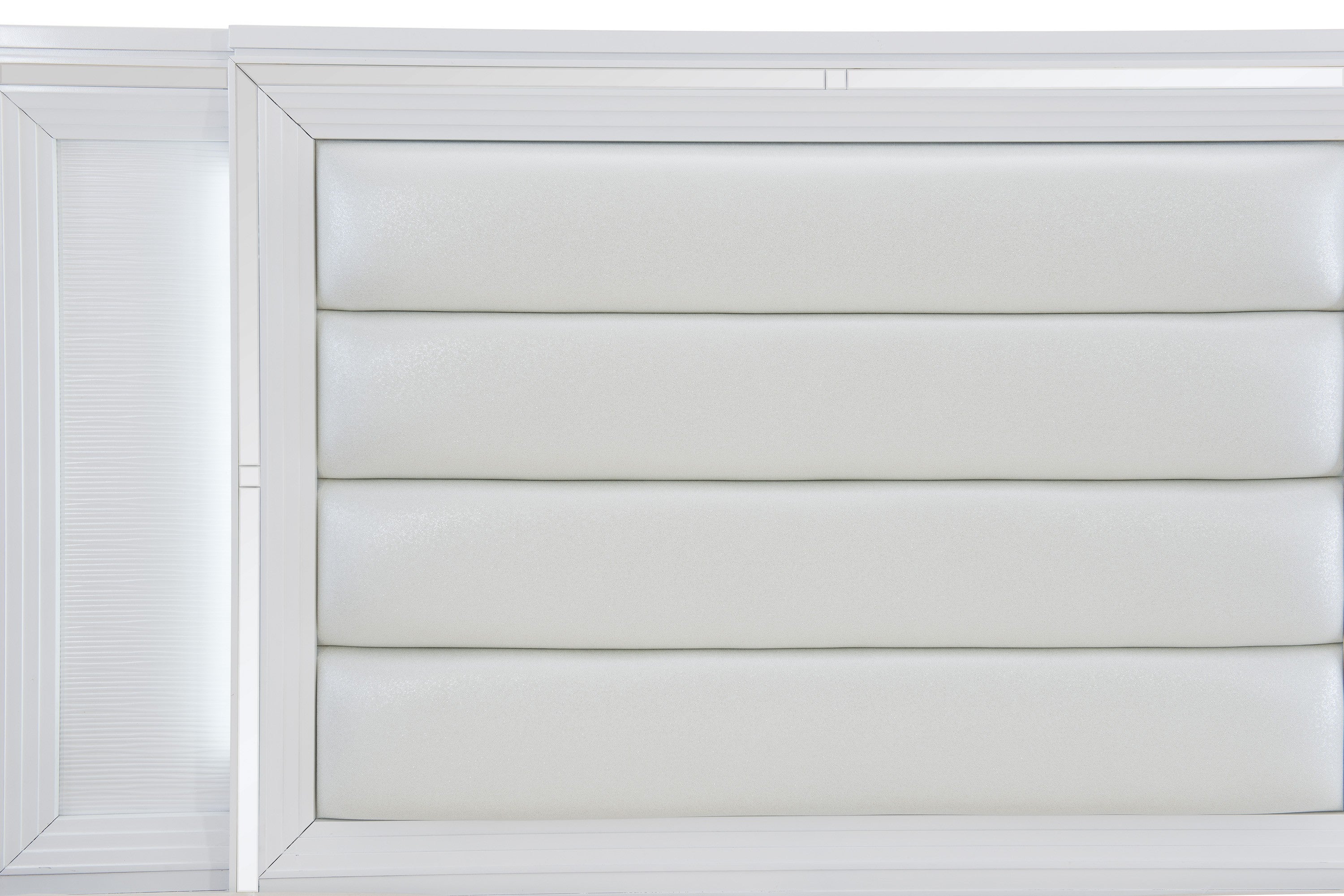 Designed to help your bedroom reach its full glamorous potential, the Tamsin Collection’s unique attributes blend to create a stylish and functional addition to your lifestyle. Mirrored framing provides dramatic enhancement to each piece in the collection, while LED back-lighting, from the vertical headboard panels and mirror, illuminates and highlights the white finish of the collection. Acrylic hardware provides unobtrusive decorative touch to the drawer fronts of the case pieces and storage footboard, with the faux leather-covered padded headboard insert lending decorative contrast to the finish of the collection. Hidden jewelry drawers in the dresser create discreet storage space for your fancy accoutrements. Also providing functional display to the collection is the available vanity. The mirrored front paired with drawer storage creates the perfect platform to prepare your glamorous self.