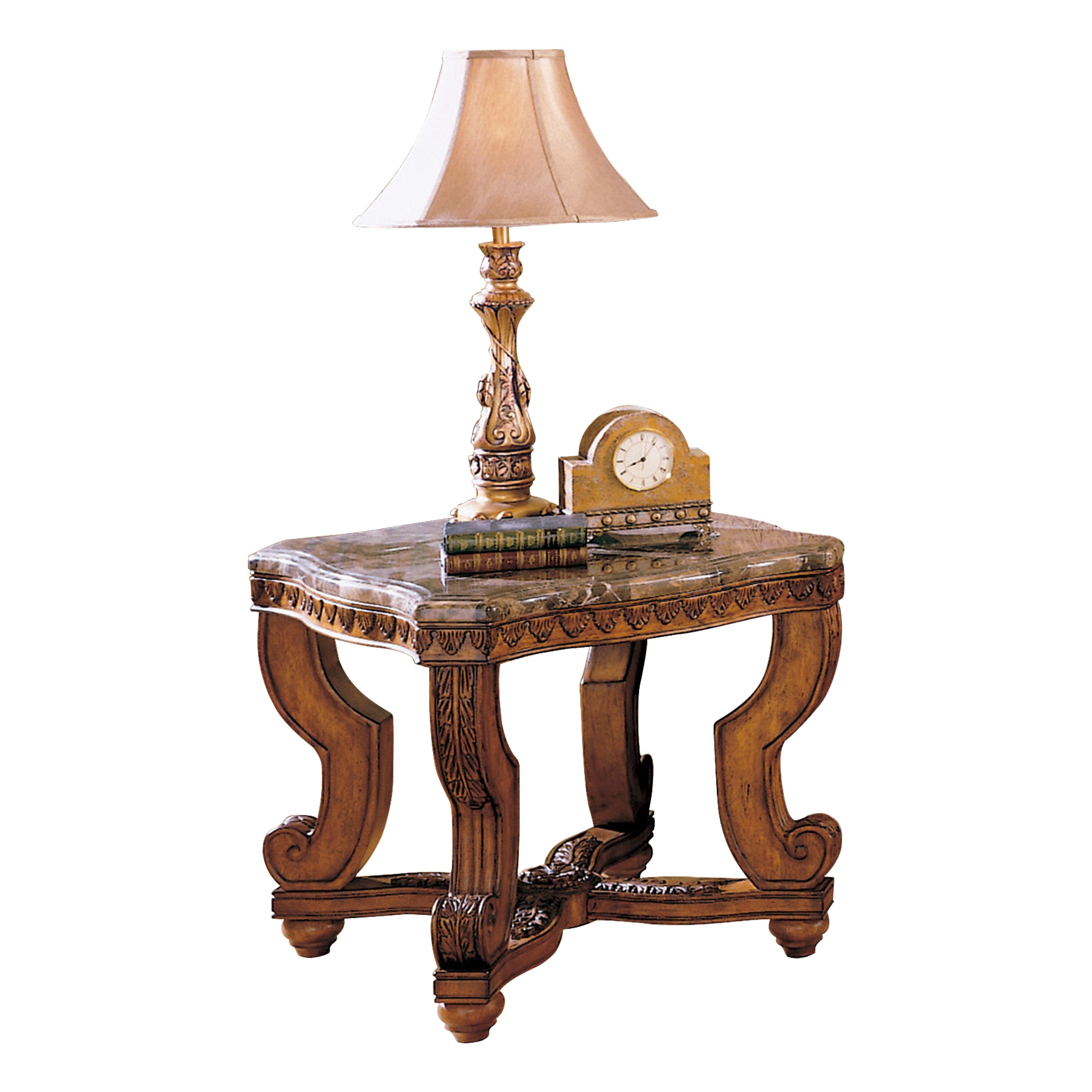 The end table of the Tarantula Collection features old world Mediterranean influence that is rich in the traditional style it emulates. Featuring a burnished brown cherry finish and a beveled marble top, the timeless look of Tarantula Collection is solidified. Coordinating cocktail table and sofa table are available.