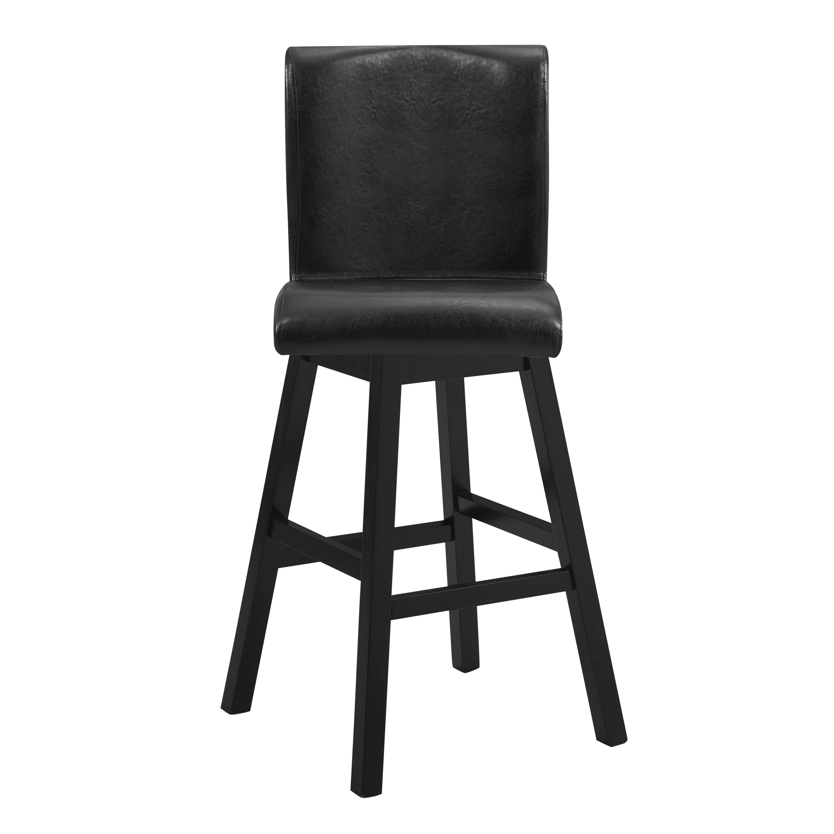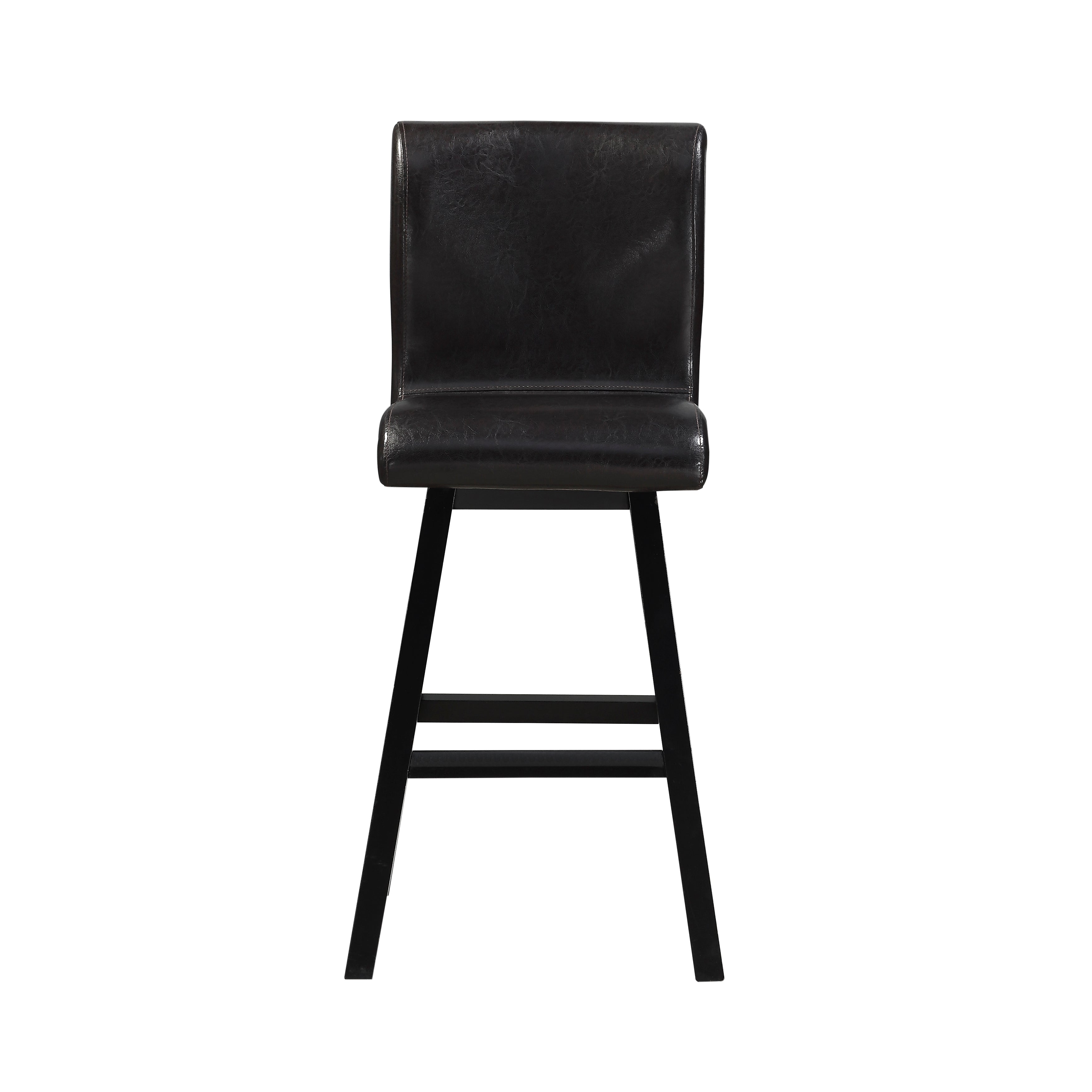 Providing functional accent to your casual dining space is the Hillshaw Collection. The dark brown faux leather upholstered 29-inch bar height chair allows for perfect placement within your casual dining space. The tailored profile of the swivel seat and chairback back are accented by dark brown finished wood legs.
