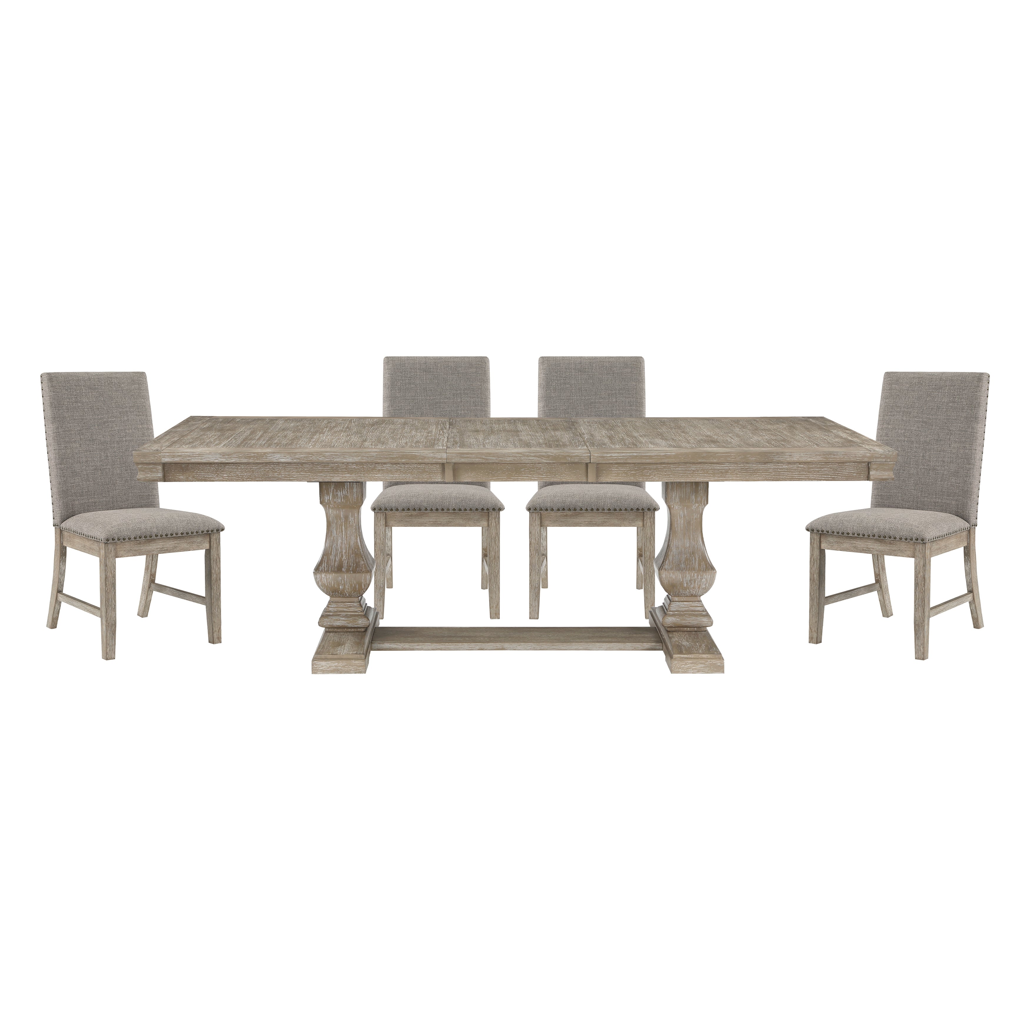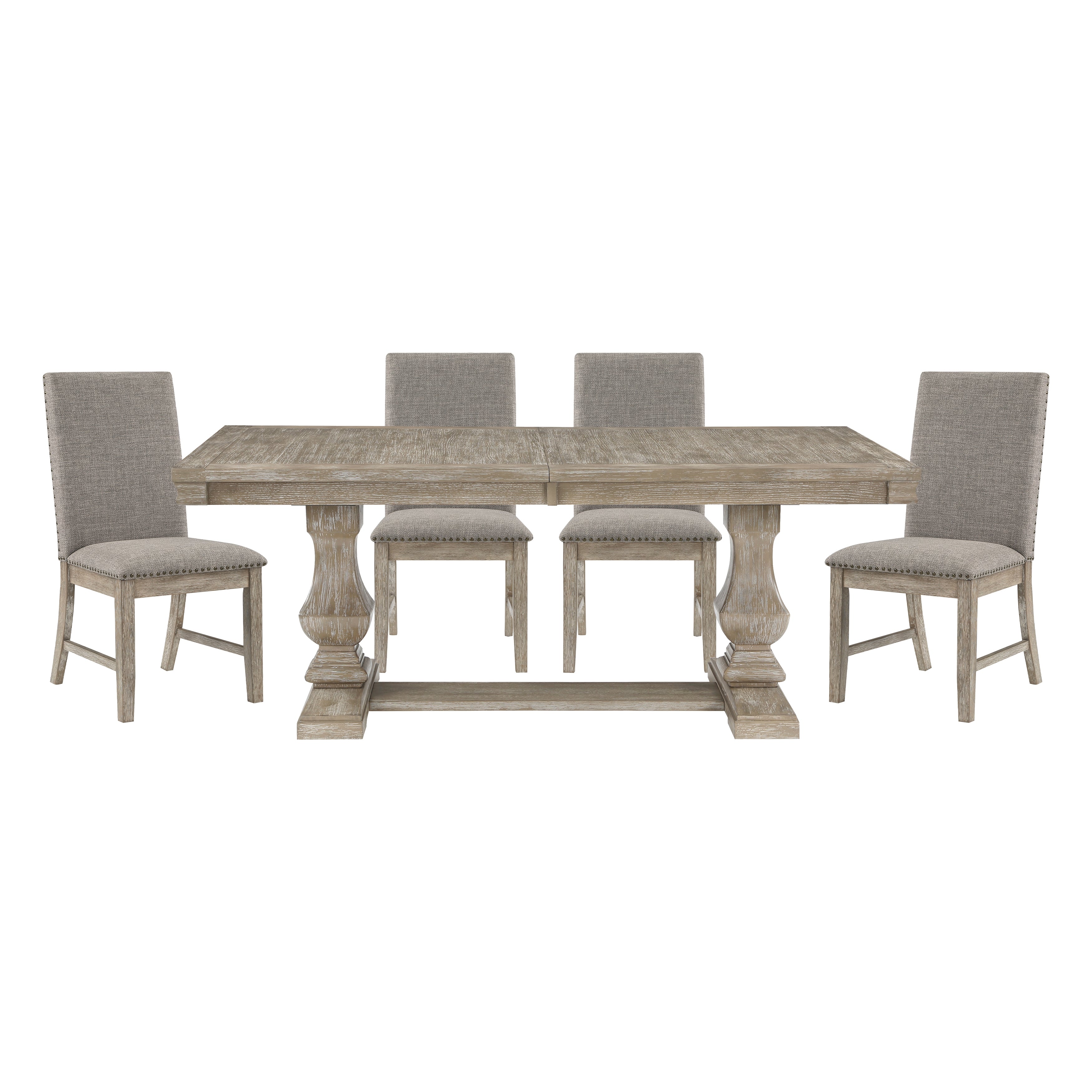 An elegant blend of traditional styling and rustic aesthetic combines to create the look of the Southlake Collection. The rectangular tabletop is supported by a double pedestal base, it’s urn profile lending distinct accent to your dining room. The wire-brushed brownish-gray finish highlights the oak veneer and solid wood construction. The brown linen-covered seats and backs of the side chairs provide complementing contrast to the table. An available bench provides an alternate seating option. The available server provides ample behind door and drawer storage in which to stow your tabletop accessories. The server doors and drawers feature nickel bar and knob hardware.
