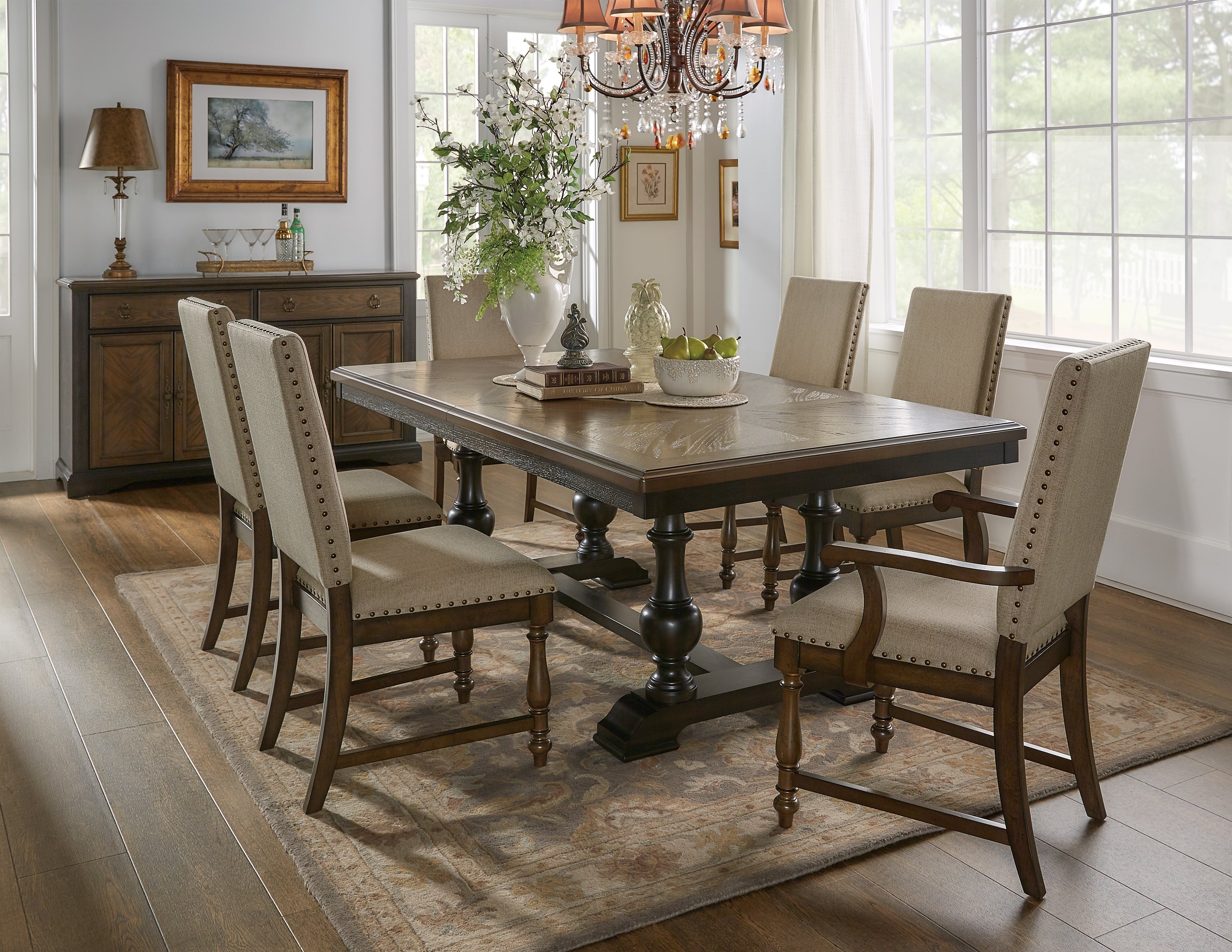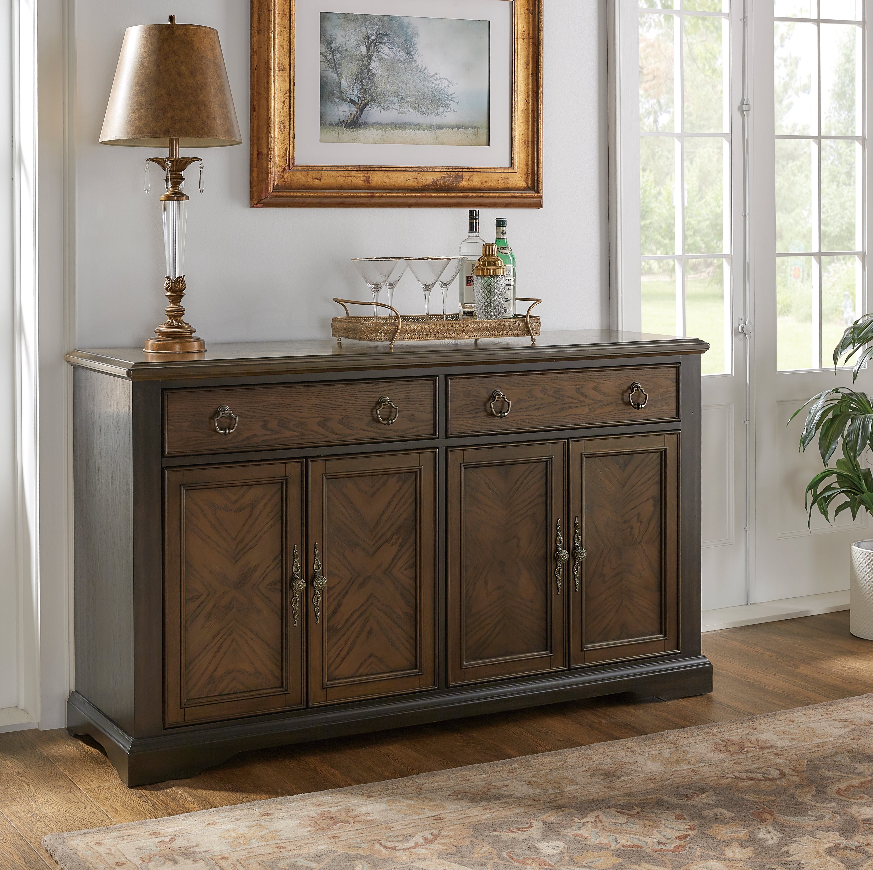 The traditional styling that comprises the design of the Stonington Collection creates an elegant country look for your dining room. Oak and walnut-inlay veneers are finished in a 2-tone brown and charcoal creating a perfect contrast that highlights the distinct patterns of each wood’s grain. Providing additional display and storage space within your dining room is the server. Antique brass-finished ring-pull and knob hardware front the drawers and doors of the server.