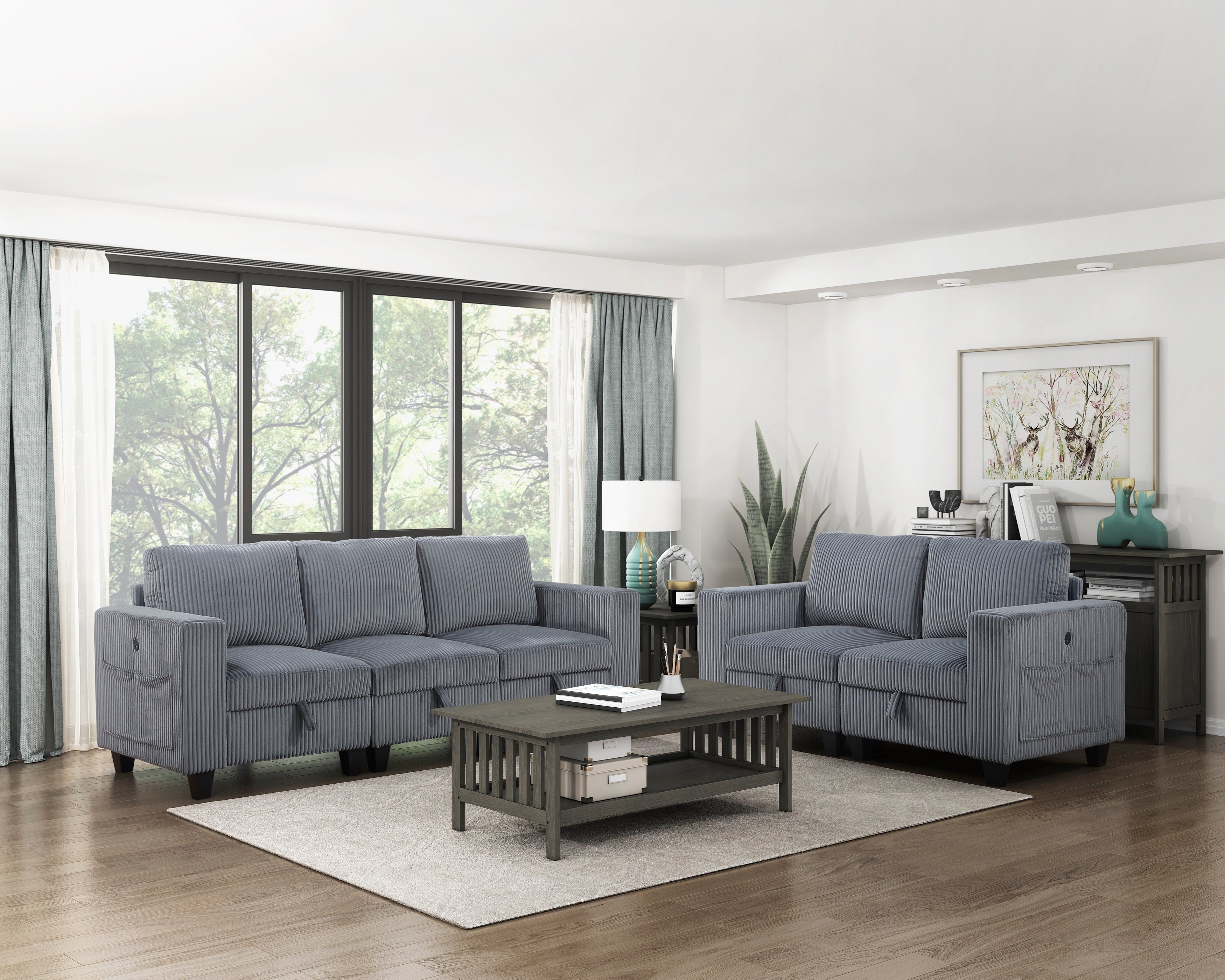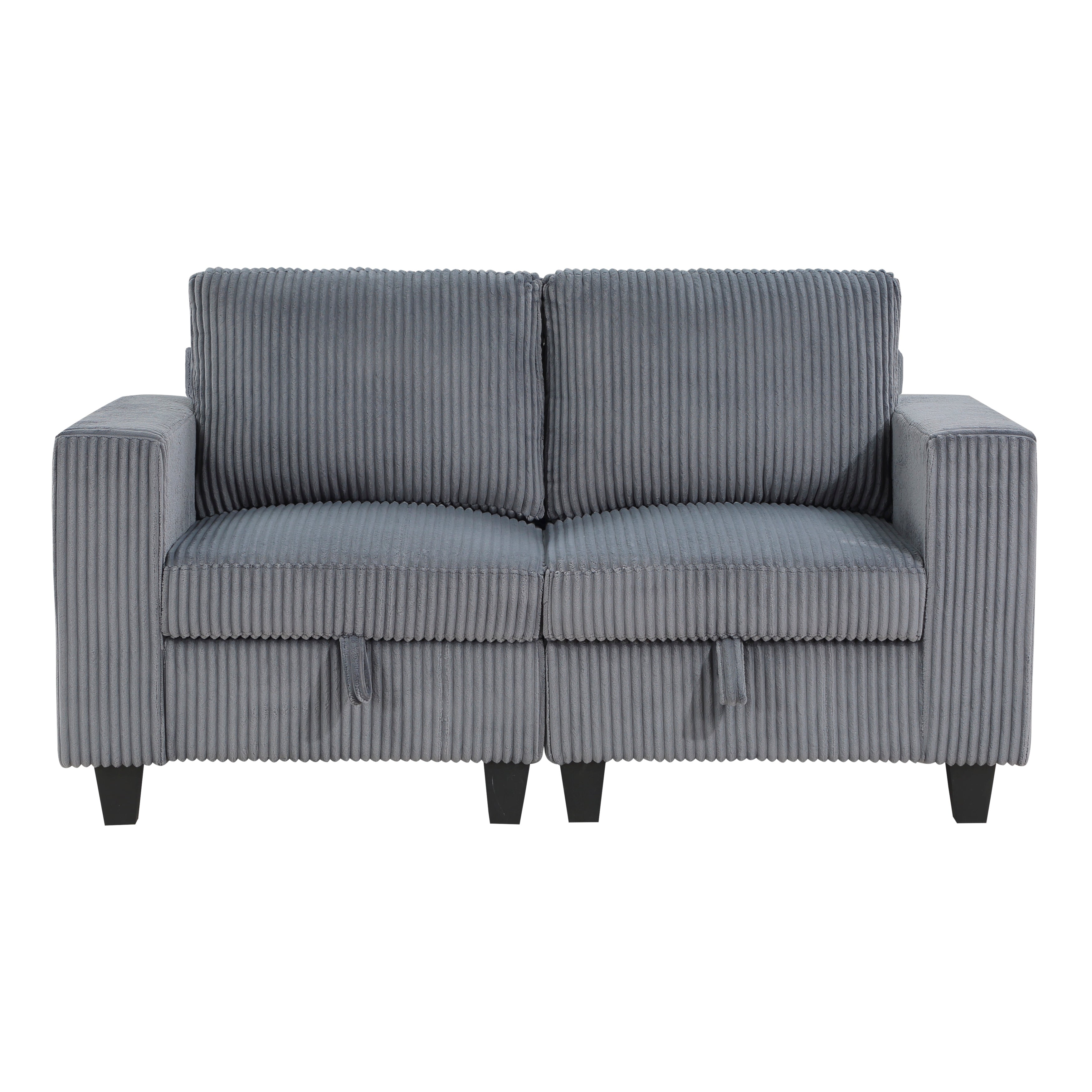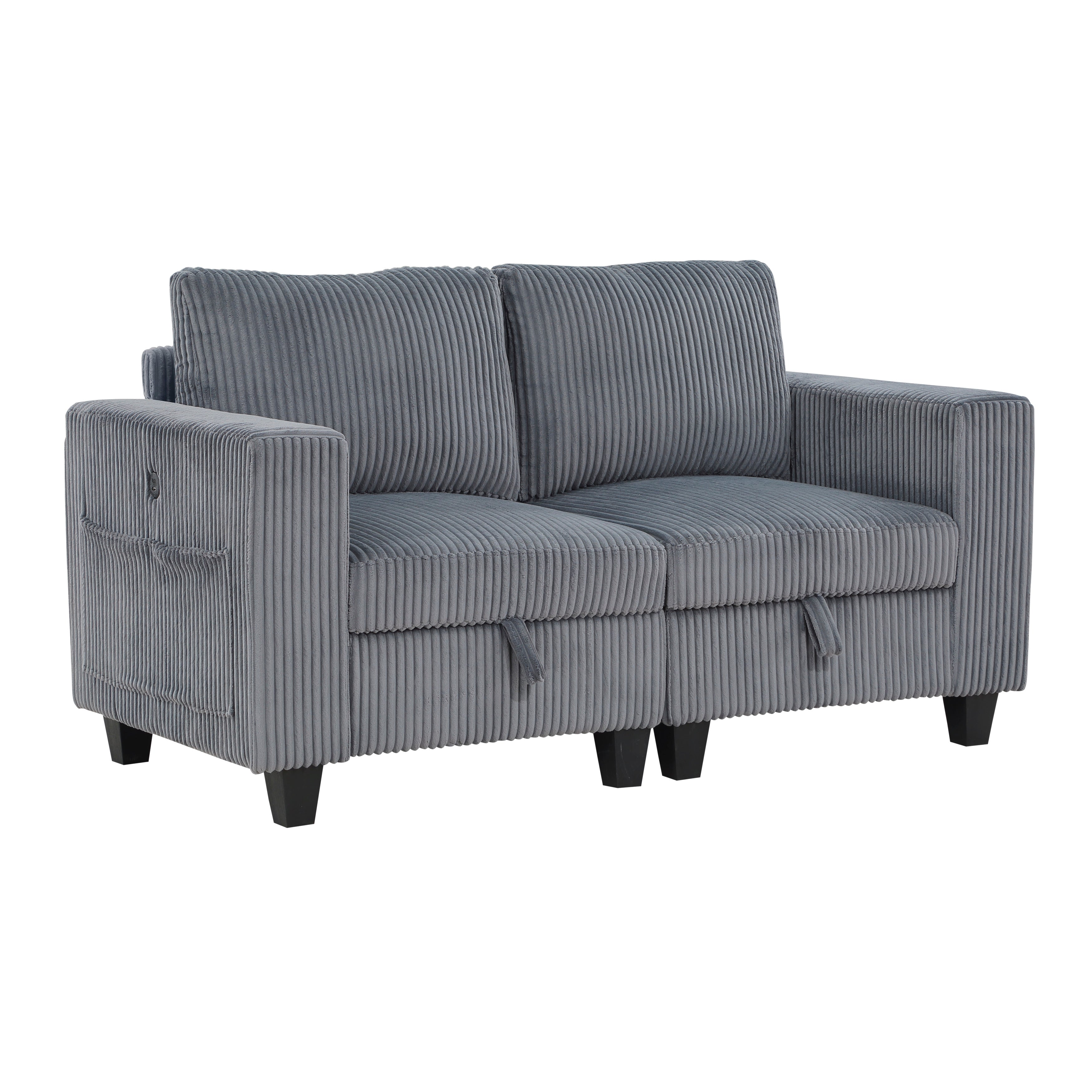 The Walterboro Collection offers a fully modular sofa and loveseat design that adapts seamlessly to any living room layout. Both pieces include hidden pull out storage drawers located beneath the armless and end seats to help keep your space organized with quick front-handle access. Each loveseat and sofa features paired end seats equipped with supportive arms and built in USB charging ports, adding everyday convenience. Upholstered in soft dark gray corduroy fabric, this collection blends modern comfort with a clean, neutral look that suits a wide range of interior styles. Perfect for flexible seating, practical storage, and contemporary living.