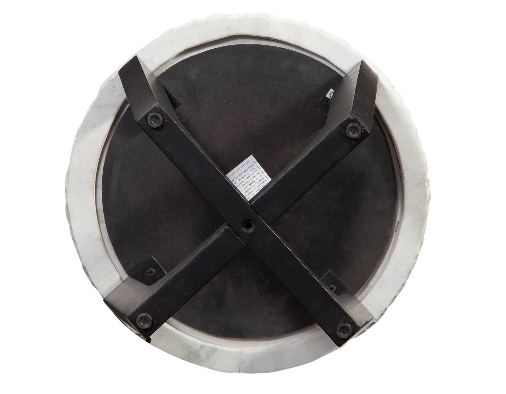 The Chrissy End Table blends modern design with natural elegance, making it a stylish accent for any space. Expertly crafted, it features a 30mm solid white marble top with a raw, live edge, combining a smooth polished surface with rugged, chiseled texture for striking contrast. Each marble top is one-of-a-kind, showcasing unique veining and natural variations that add to its organic charm. The 20” round top sits on a solid wood sled base, finished in bold black for a sleek, modern touch.