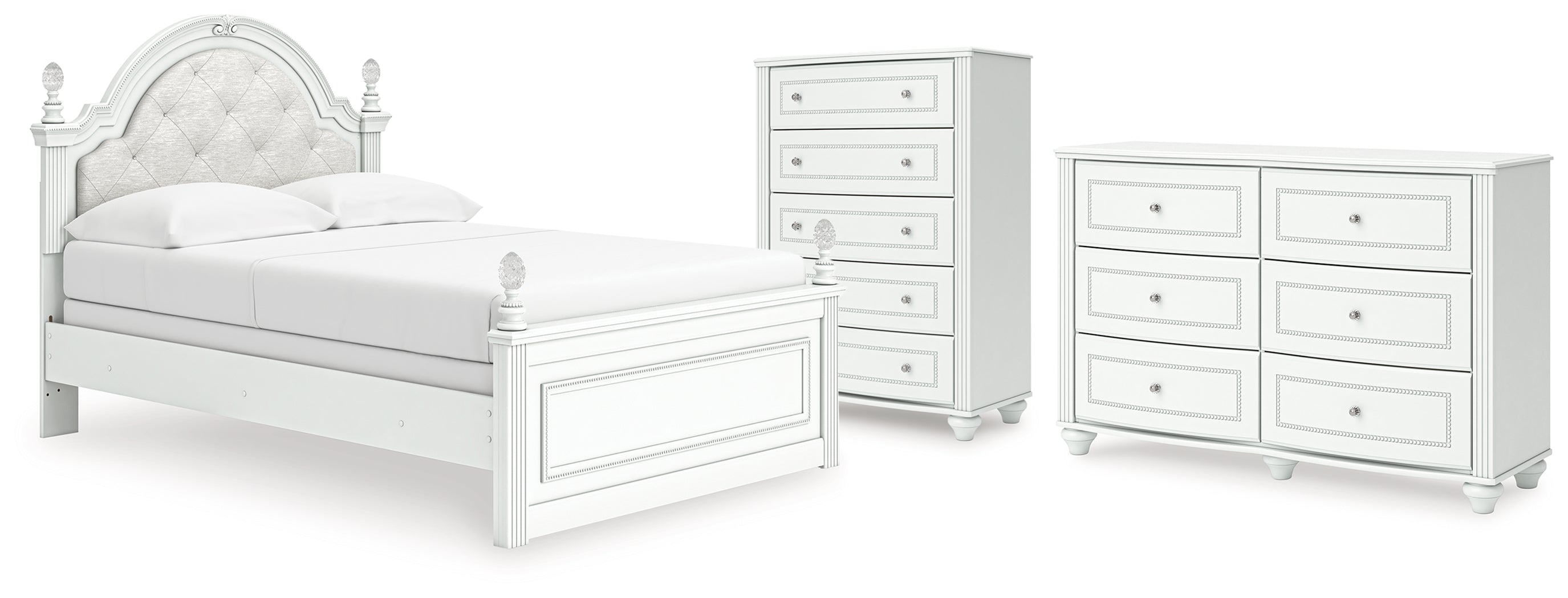 Kozlani Full Upholstered Panel Bed with Dresser and Chest in White