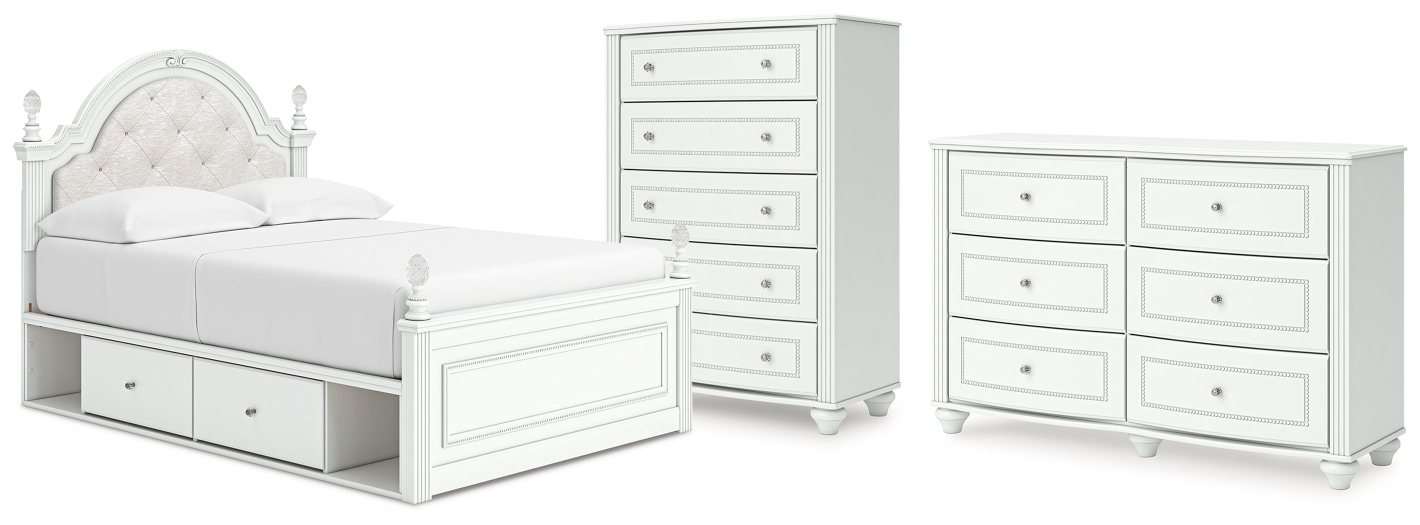Kozlani Full Upholstered Panel Storage Bed with Dresser and Chest in White