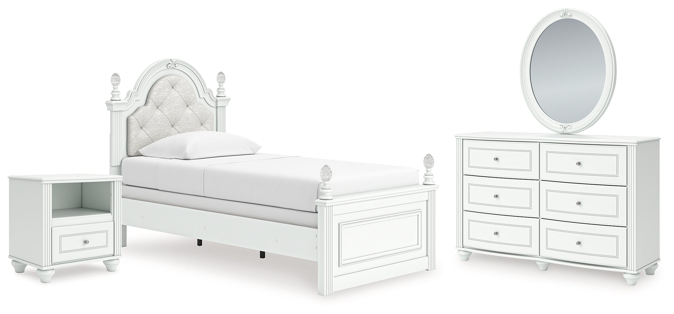 Kozlani Twin Upholstered Panel Bed with Mirrored Dresser and Nightstand in White