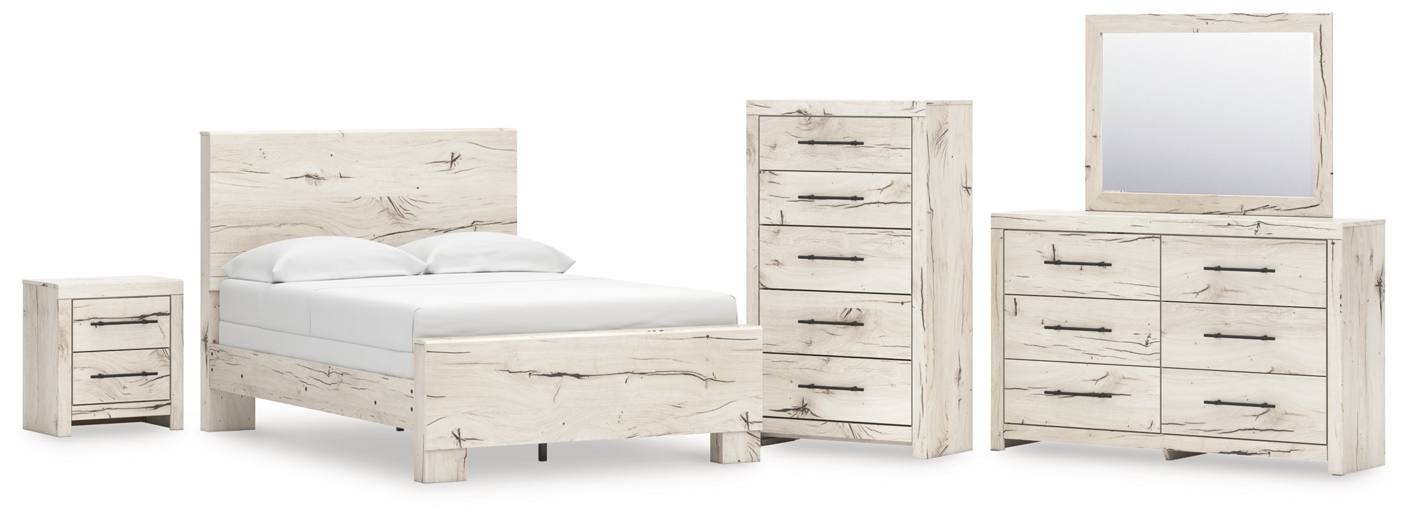 Lawroy Full Panel Bed with Mirrored Dresser, Chest and Nightstand in Light Natural
