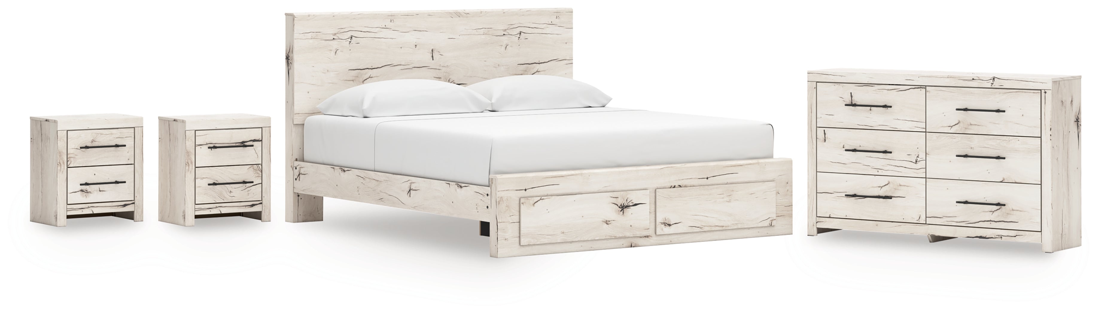 Lawroy King Panel Storage Bed with Dresser and 2 Nightstands in Light Natural