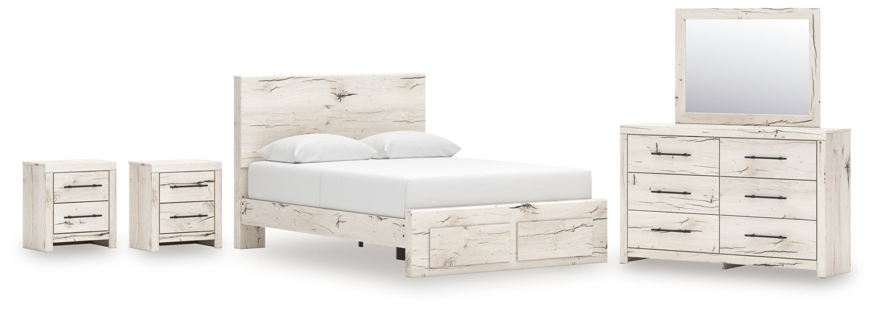 Lawroy Queen Panel Storage Bed with Mirrored Dresser and 2 Nightstands in Light Natural