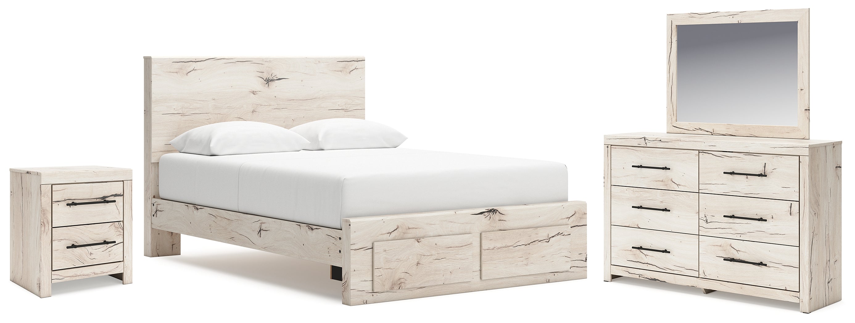 Lawroy Queen Panel Storage Bed with Mirrored Dresser and Nightstand in Light Natural