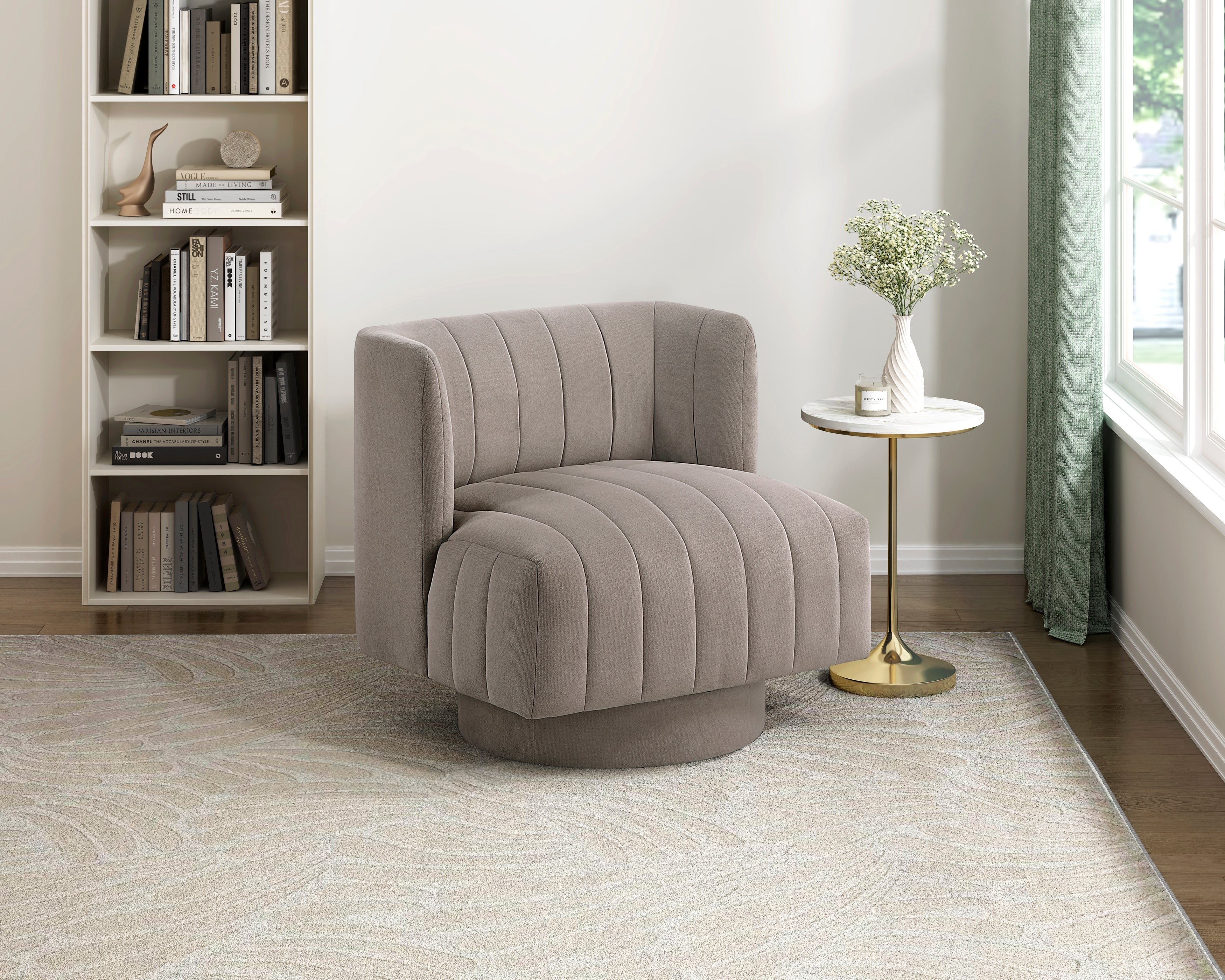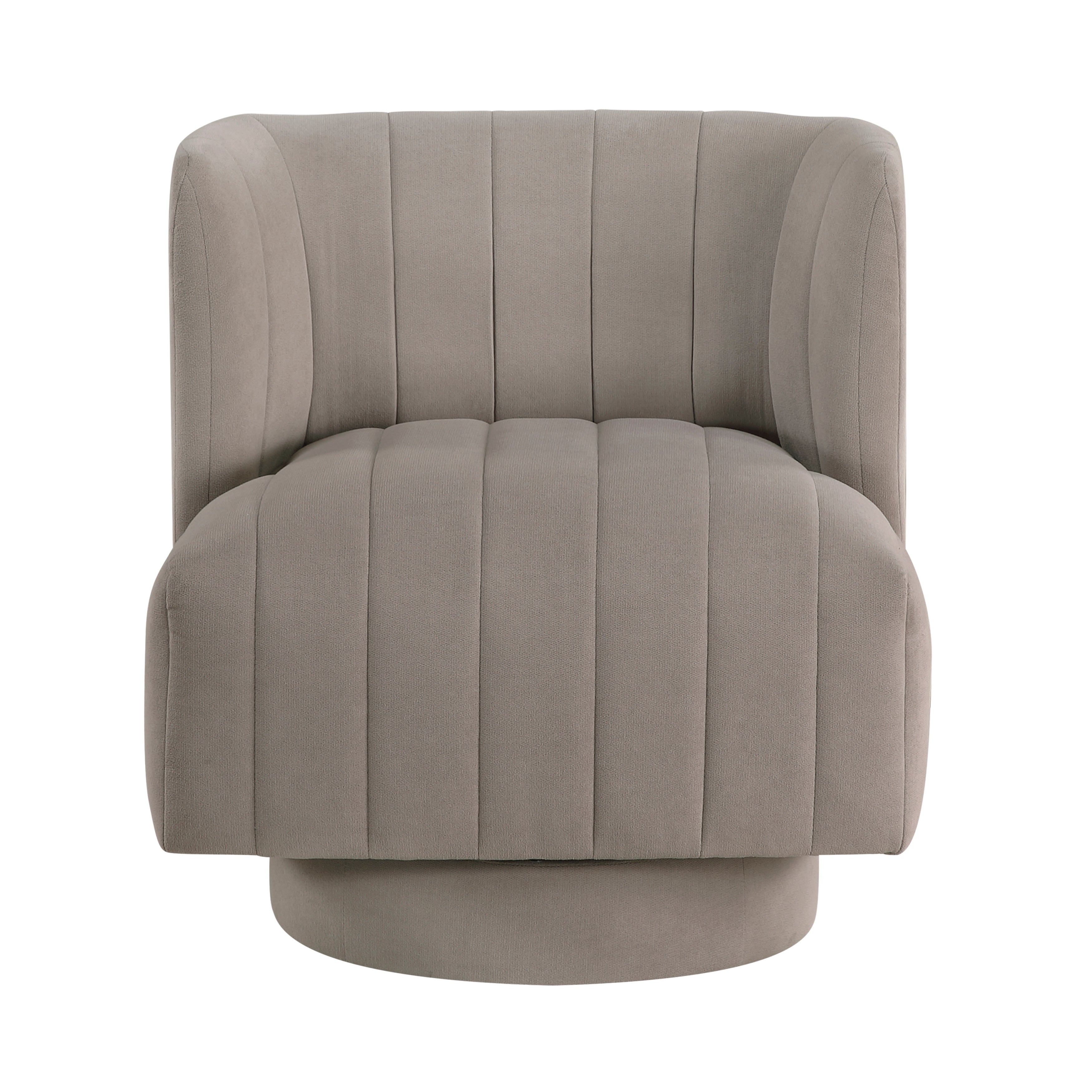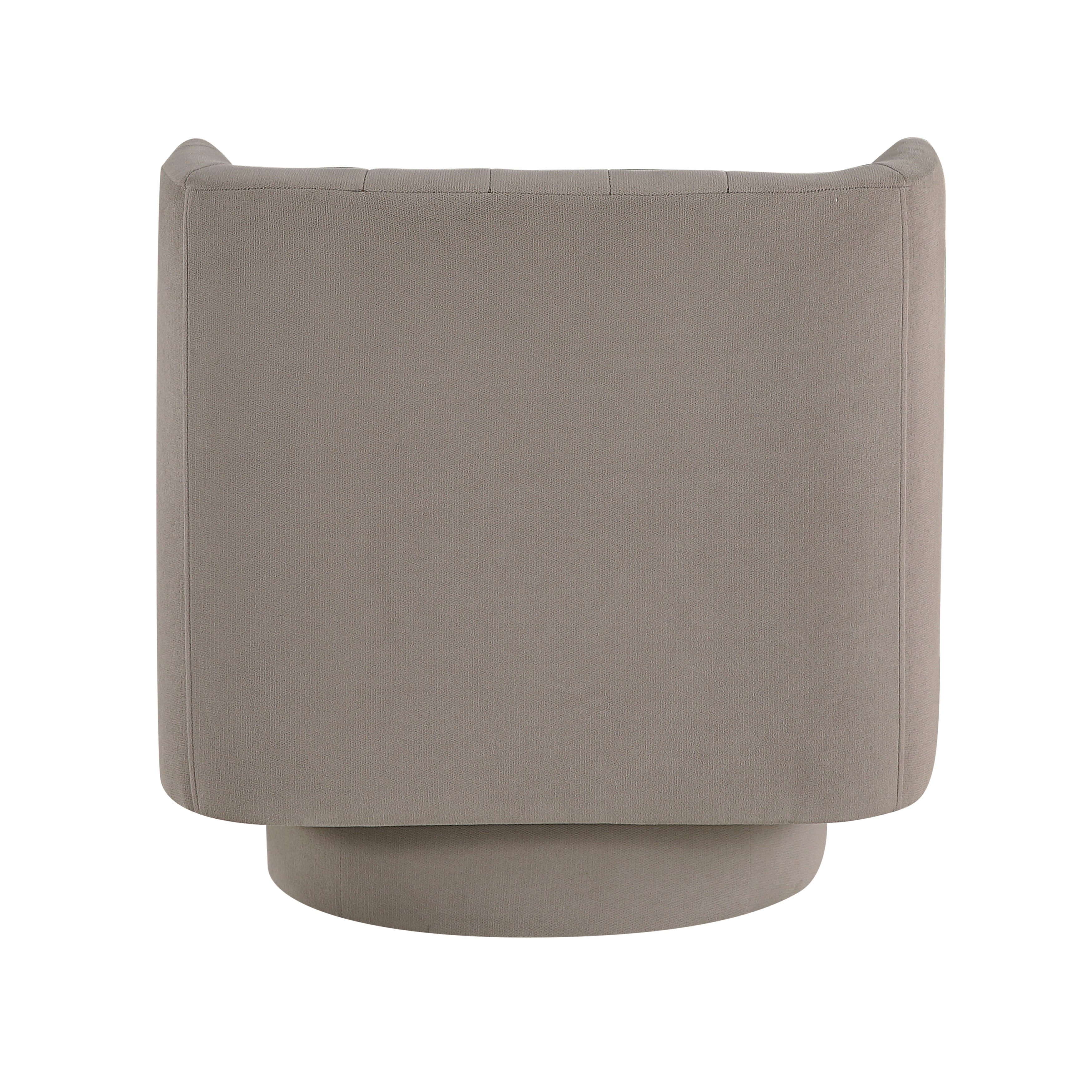 This chic modern swivel chair, upholstered in a luxurious textured fabric with stylish channel tufted details, offers a perfect blend of comfort, functionality, and contemporary design for your living space. Its unique barrel back design and attached seat cushion provide inviting comfort, while the robust plywood frame and metal swivel base ensure stability and smooth 360-degree rotation. Ideal as an accent chair or a functional seating option, this piece adds a touch of modern elegance and versatility to any room. Assembly is required to bring this delightful and dynamic chair into your home.