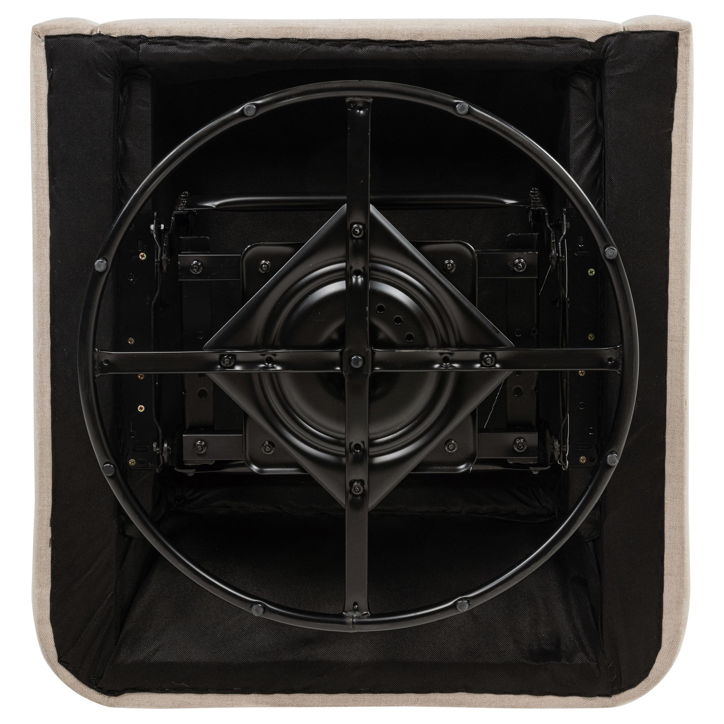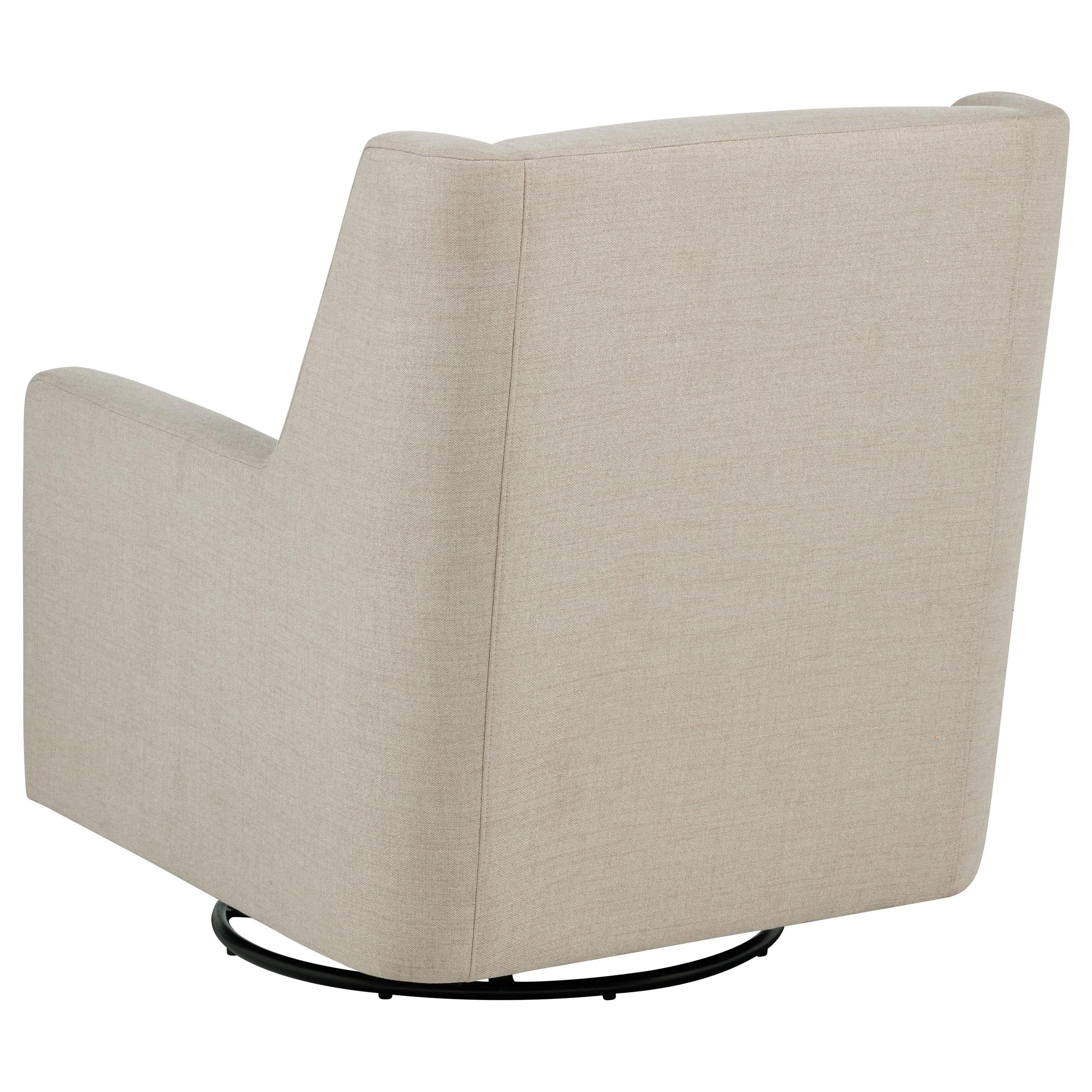 Comfort flows from every angle in this swivel accent chair. With gently sloped arms and a tall, tailored backrest, it wraps the body in a soft, supportive shape. Upholstered in smooth fabric and mounted on a black metal base, it glides with ease to match your movements. Clean edges, plush cushioning, and fluid form blend practicality with understated romance—making it ideal for nurseries, reading nooks, or refined lounge spaces.