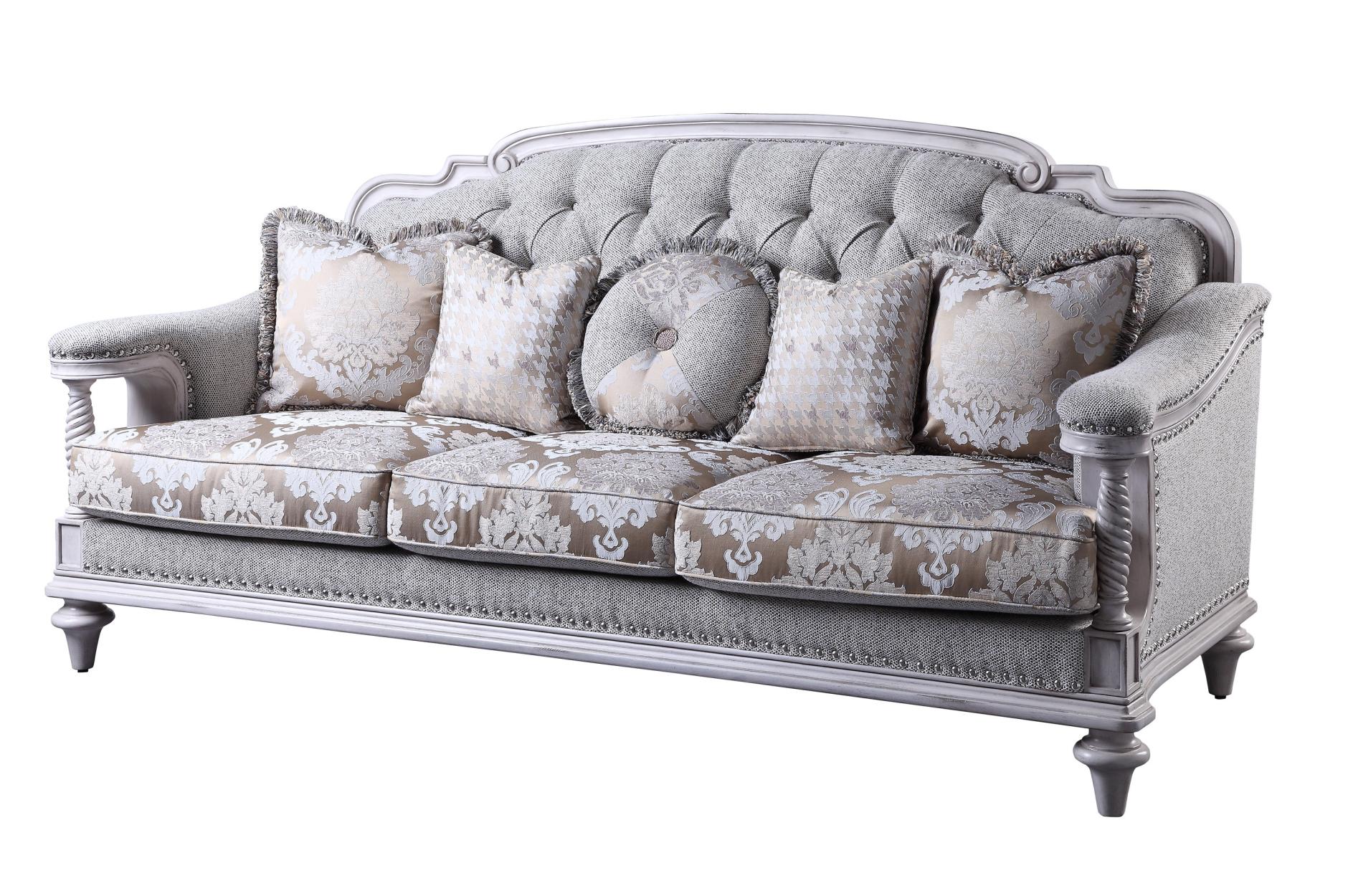 With coloring that is reminiscent of French Provincial styling and decorative accent that lends to Old World European design, the Amacio Collection is a study in the elegance of texture and visual movement. The show wood frame is finished in Antique white that pairs effortlessly with the textured grey fabric of the seat backs and the floral damask-style seats. Button tufting lends contouring to the profile of the seatbacks while toss pillows are featured in decorative patterns for complementing accent. Sweeping curved arms flow and are met by the exquisite twist of a carved pillar support. Nail head accent provides further decorative flair to the collection.