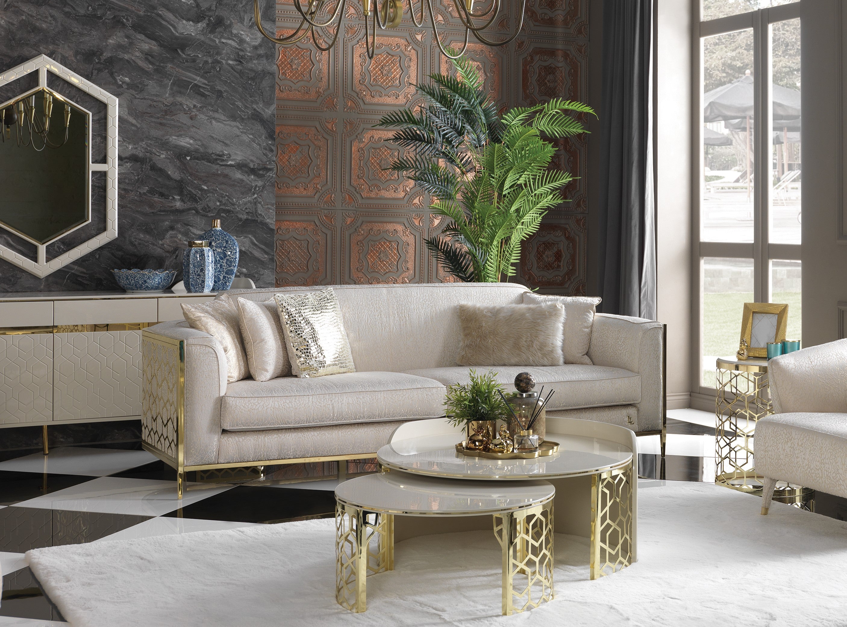 The Ferani Ivory Living Room Set brings a bold statement of modern luxury through its sculptural design, rich materials, and architectural accents. This distinguished collection includes the iconic Ferani 3-Seat Sofa, the elegantly curved Ferani Angel Chair, and the stunning Ferani TV Stand, each piece designed to create an immersive, upscale living experience. A sophisticated ivory color palette pairs seamlessly with gold metallic finishes and linear silhouettes, making this set the perfect fusion of comfort, glamour, and modern artistry. Whether placed in a penthouse suite or a curated living room, the Ferani Set offers an unforgettable visual presence with elevated functionality.