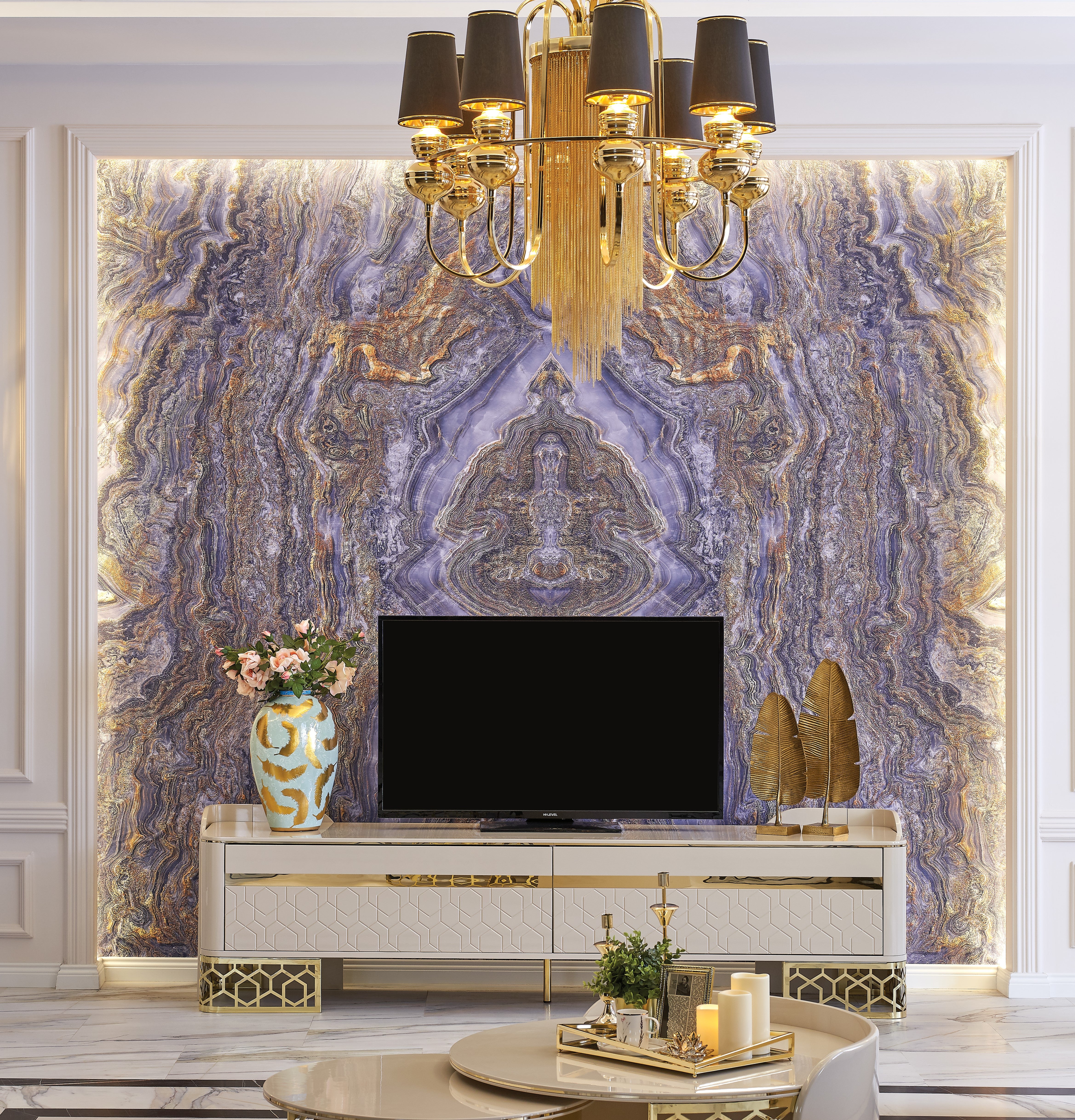 Statement TV Stand: A high-gloss, geometric front design with gold-detailed legs and integrated storage for media essentials.