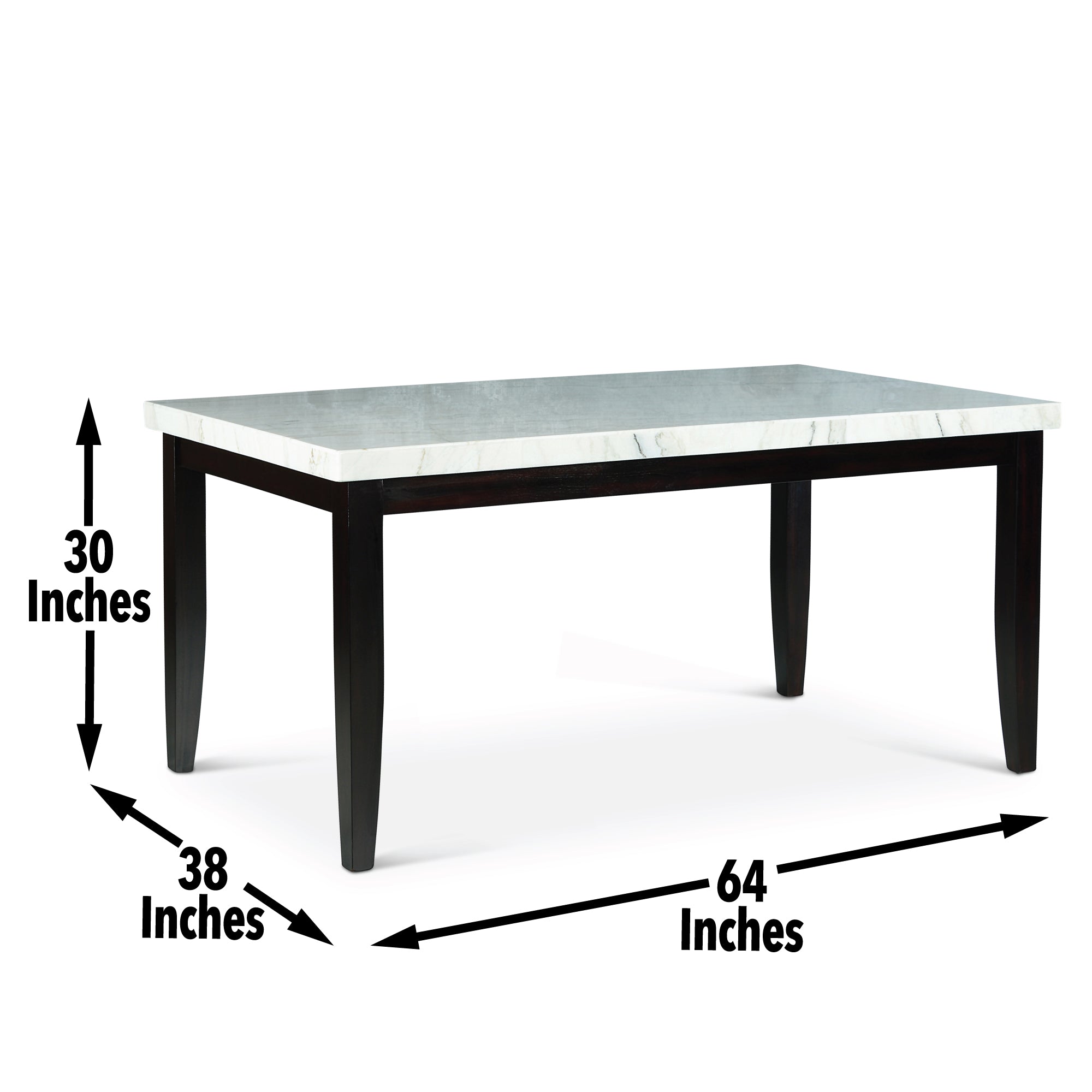 A modern take on dining, the Westby features a stunning white marble top with hints of black mineral accents that coordinates beautifully with the ebony pewter nailhead trim chairs and bench.