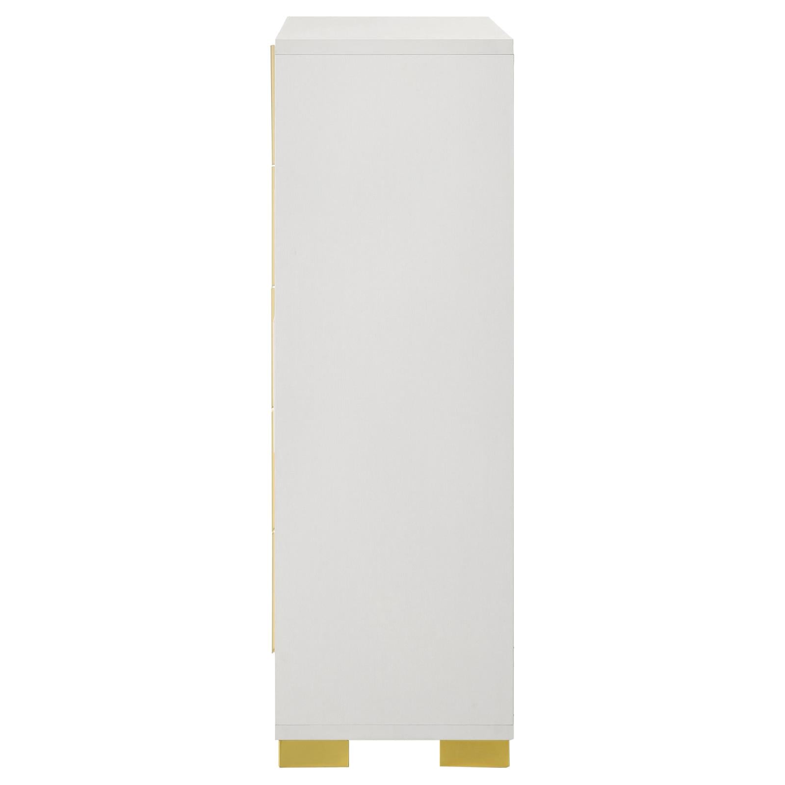 Minimalism never looked so elegant as it does in this elegant five-drawer chest, an excellent option for your updated bedroom ensemble. Modern design details produce a chic vertical chest with an Art Deco vibe and tons of storage space. Made of wood products, this five-drawer chest features a versatile finish with accenting from gold finish metal, placed carefully to emphasize a geometric linear effect. Store incidentals and accessories in drawers operating smoothly on center metal glides. English dovetail drawer construction embellishes this chest’s quality, as vertical gold metal drawer hardware offers a unique impact.