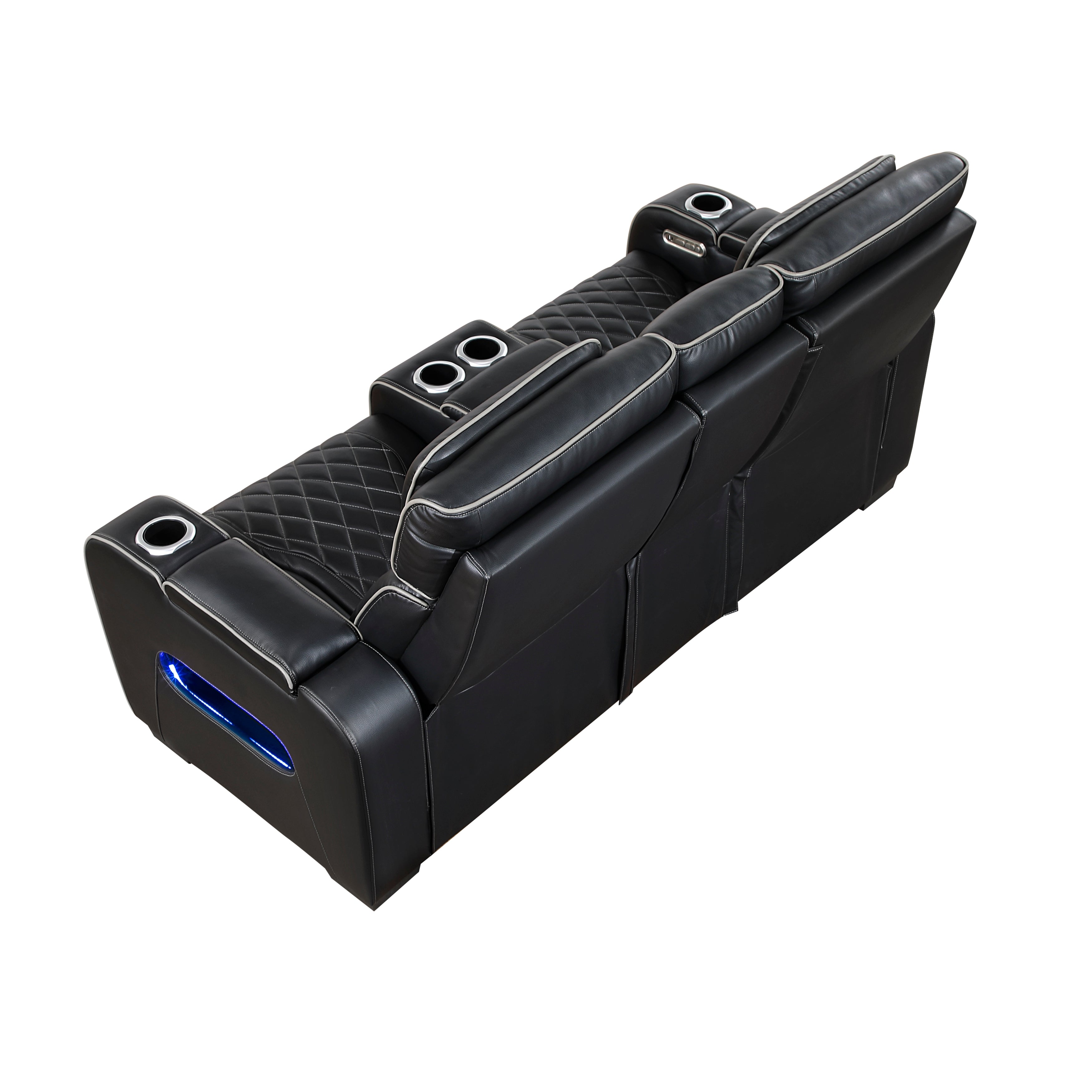 Experience unparalleled comfort and convenience with this black faux leather power double reclining loveseat. This luxurious loveseat is designed for ultimate relaxation with features like independent power reclining, adjustable power headrests, and ambient LED lighting. The center console provides storage and cup holders for added convenience, while built-in USB ports keep your devices charged. Top and side storage arms offer additional storage space for remotes or other essentials. The sleek black faux leather upholstery with diamond-stitched detailing adds a touch of modern sophistication, making this loveseat a perfect centerpiece for your home theater or living room.