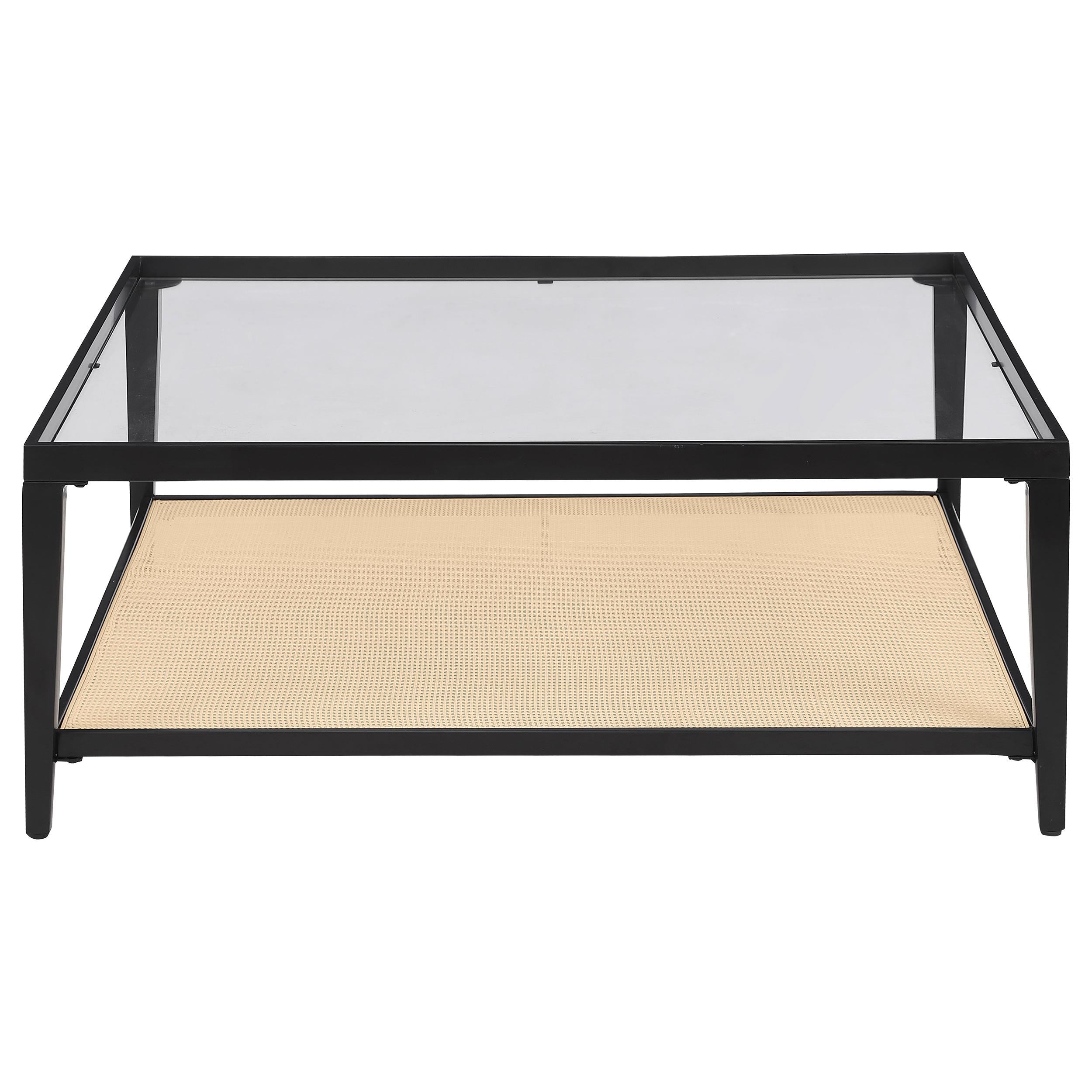 Amherst Black Glass Top Metal Coffee Table with Cane Shelf
