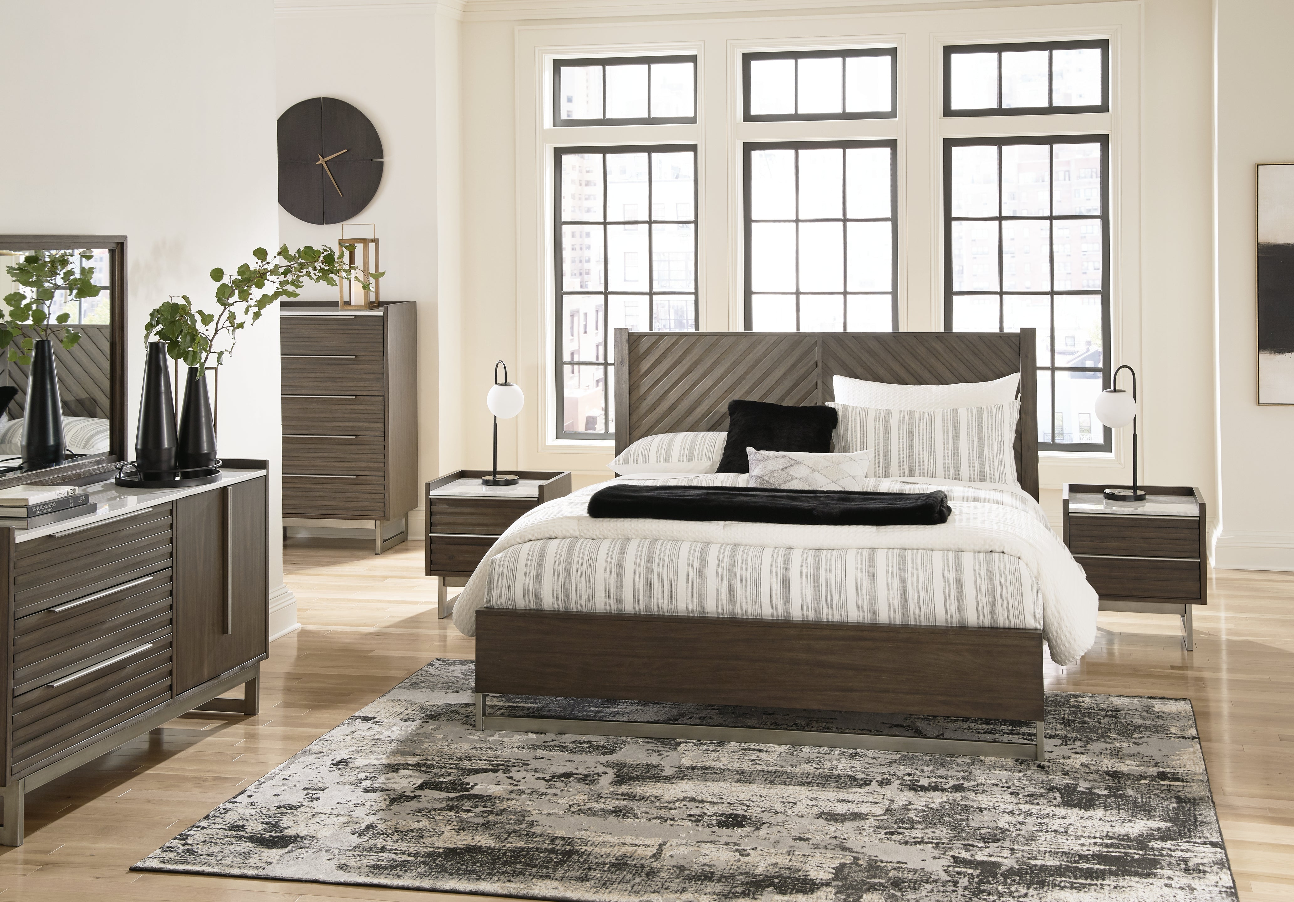 Clean lines lend sophistication and structure to this bedroom package. A complex rich grayish brown finish creates visual interest and adds to the contemporary vibe.
