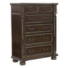 Old-World European styling is captured in the dramatically elegant Catalonia Collection. Traditional design elements reign at every turn – egg and dart molding, acanthus leaf carving, bead molding, gold tipping and extravagant carvings – creating a sophisticated look for your bedroom. Each drawer front features dark bronze fixed-drop hardware with decorative flourish that furthers the elegant appointments that embellish this collection. A traditional cherry finish is utilized to highlight the cherry veneer of the set and decorative inlay patterns found on the chest top.
