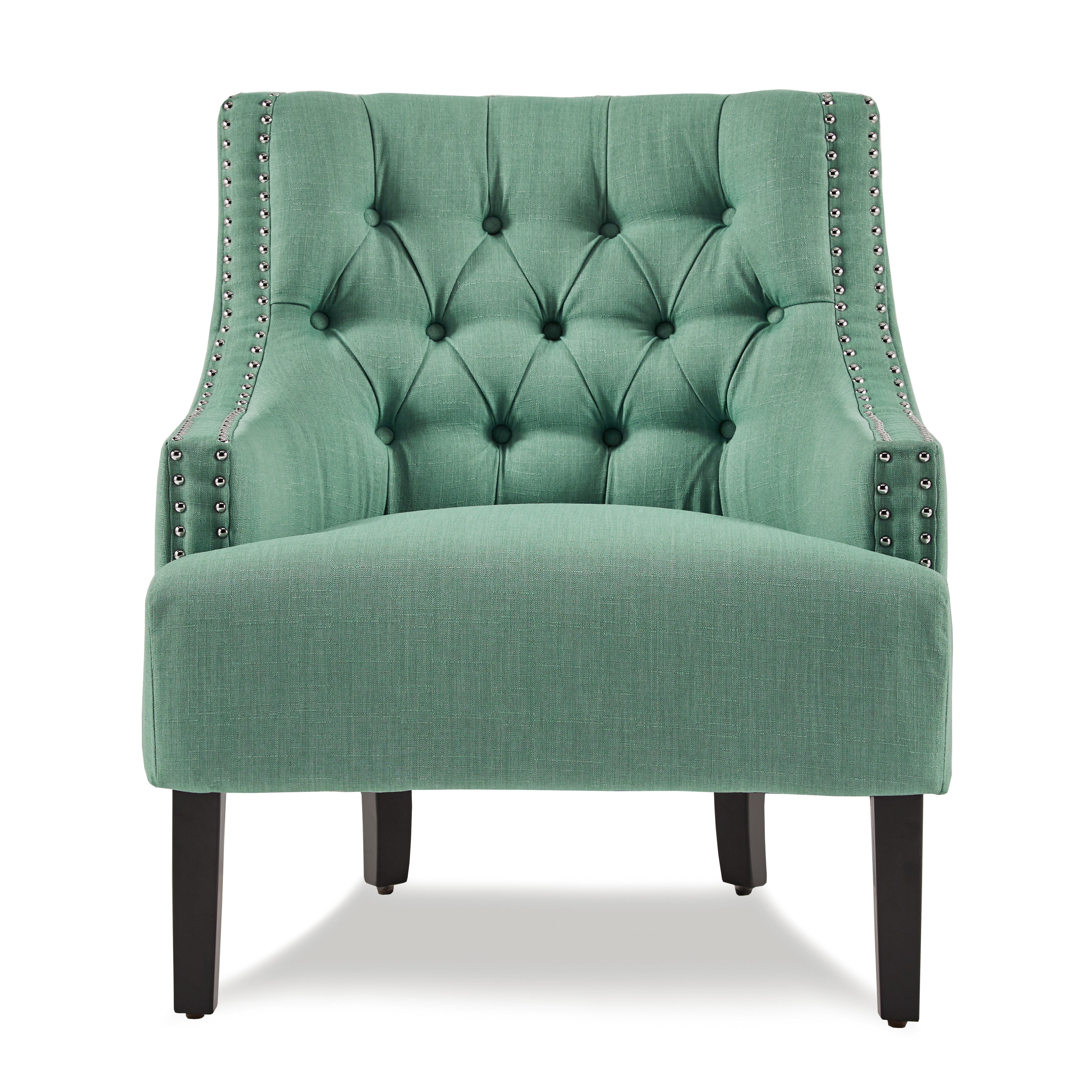 High polish nailhead accents and defines the profile of the Charisma Collection. This modern traditional teal fabric-covered accent chair provides a stylish, yet functional addition to your home. The chair is offered in 3 additional distinct colors: chocolate, taupe and indigo.