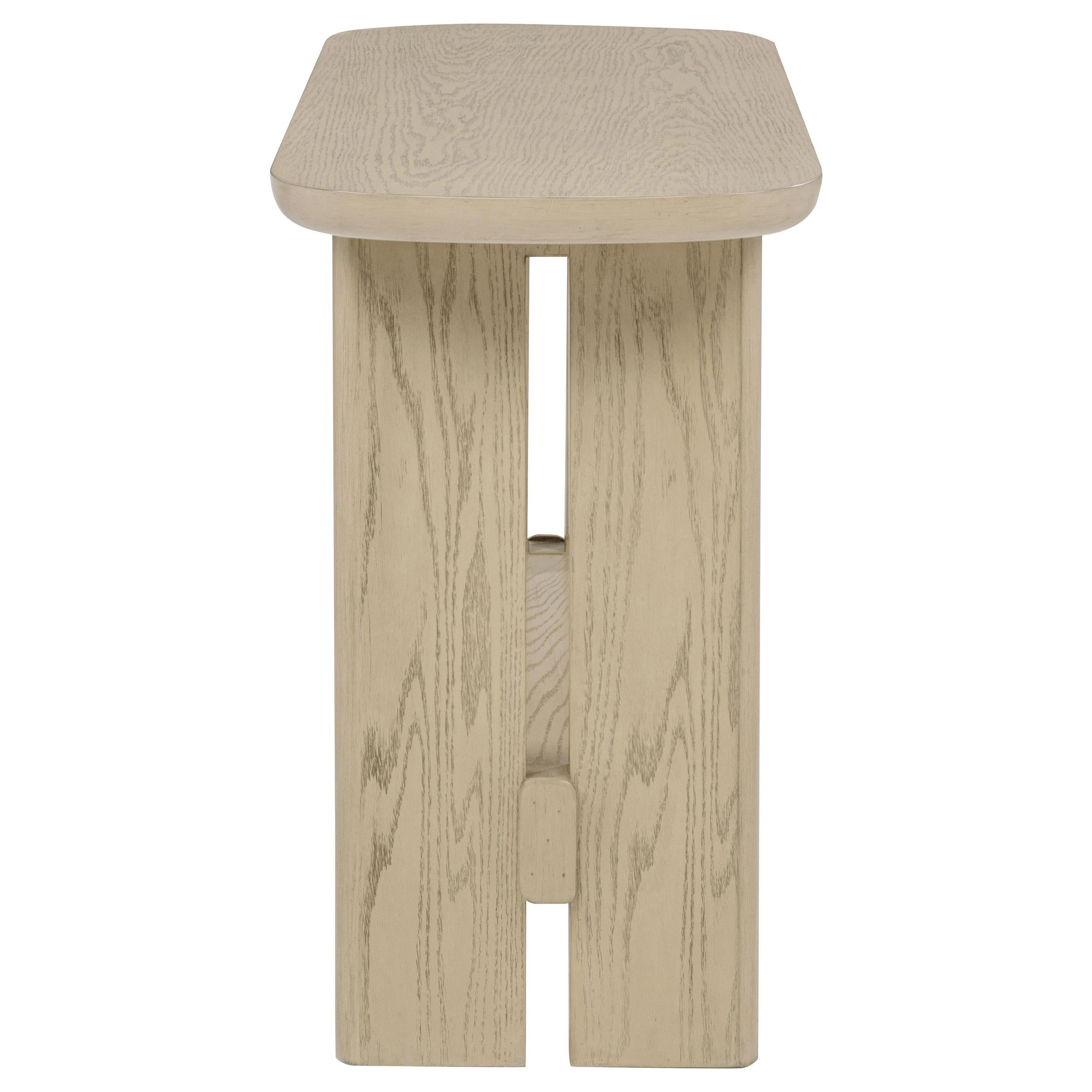 This console table embraces California coastal modern living with a design that blends authenticity and comfort. A 1970s-inspired base supports a rectangular top with softly rounded corners and a sculpted underside, lending a light yet grounded profile. Crafted from solid poplar, engineered wood, and oak veneer, it offers strength and natural appeal. A lower shelf enhances functionality, making this sofa table ideal behind a couch or as a console in an entryway or living room.