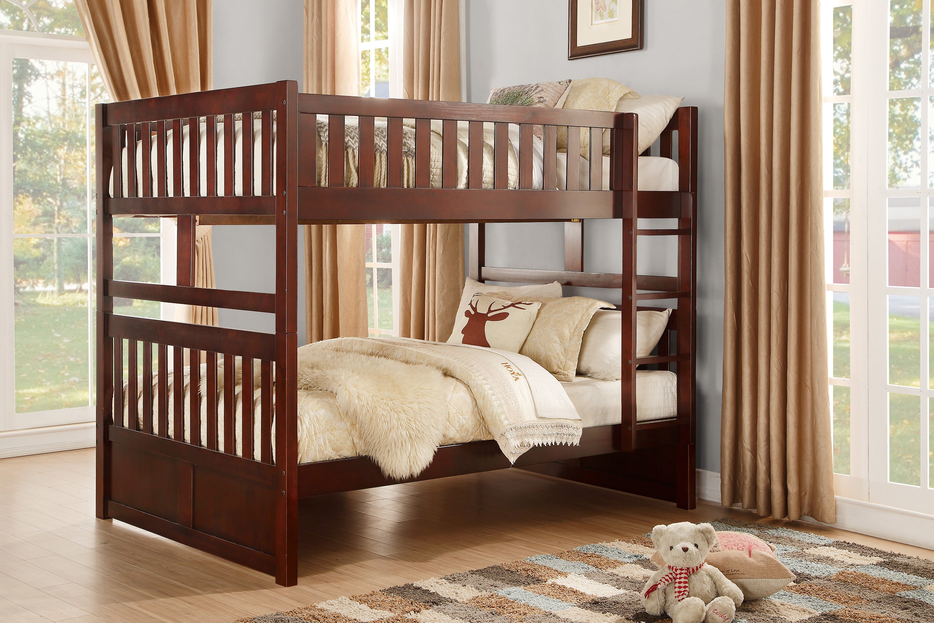 Maximizing sleep space is achieved with the stylish Rowe Collection. This transitional full over full bunkbed is featured in a dark cherry finish making it an appropriate choice for a number of youth bedroom settings.