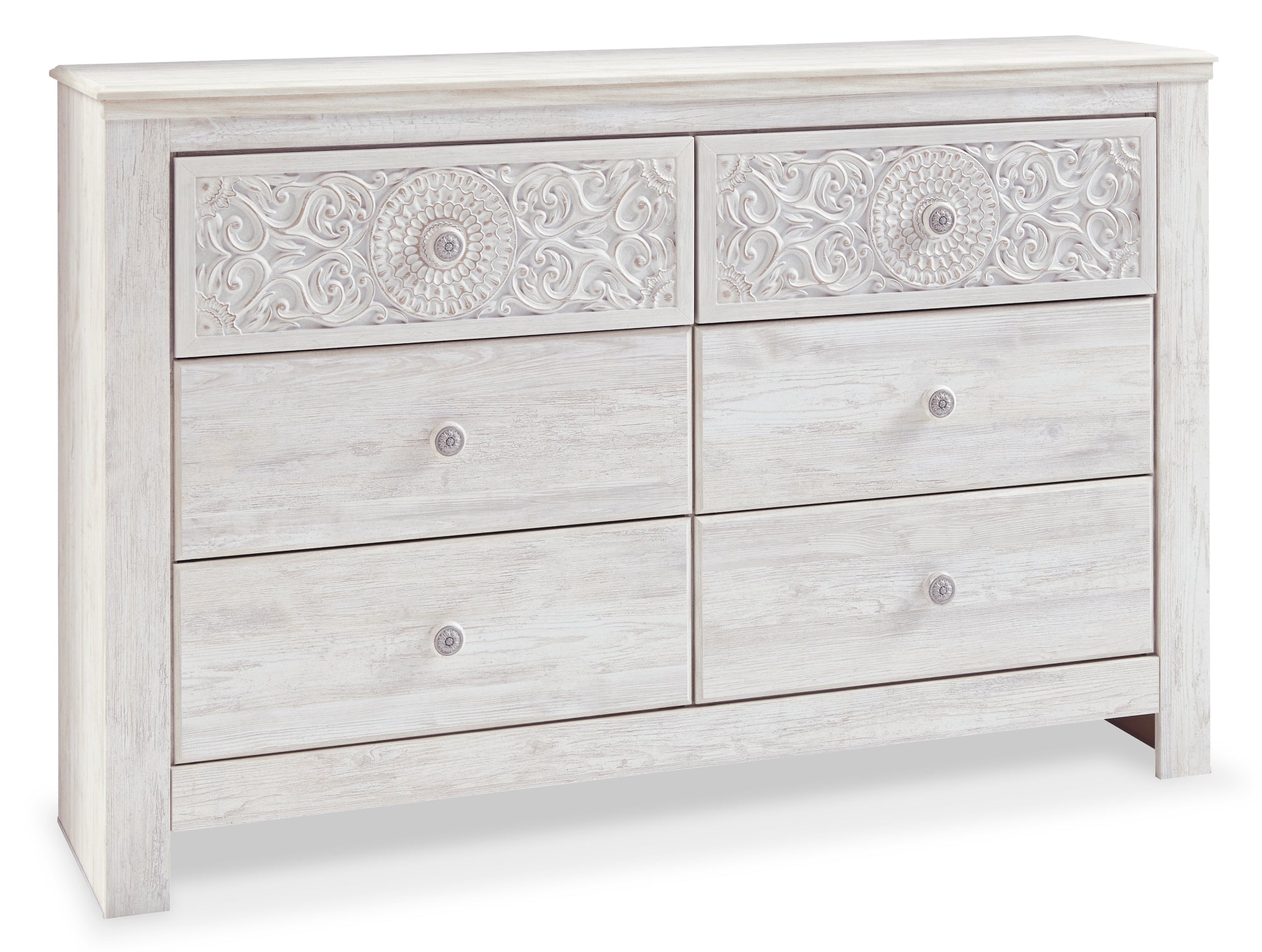 A one-of-a-kind trendsetter deserves a bedroom retreat that celebrates their unique flair—and the Paxberry bedroom set is so befitting. The exquisitely-carved headboard is a testament to boho-chic style. With subtle bohemian touches, the headboard and dresser are delightfully different, and a charming whitewashed finish sets a foundation for a room bursting with personality.