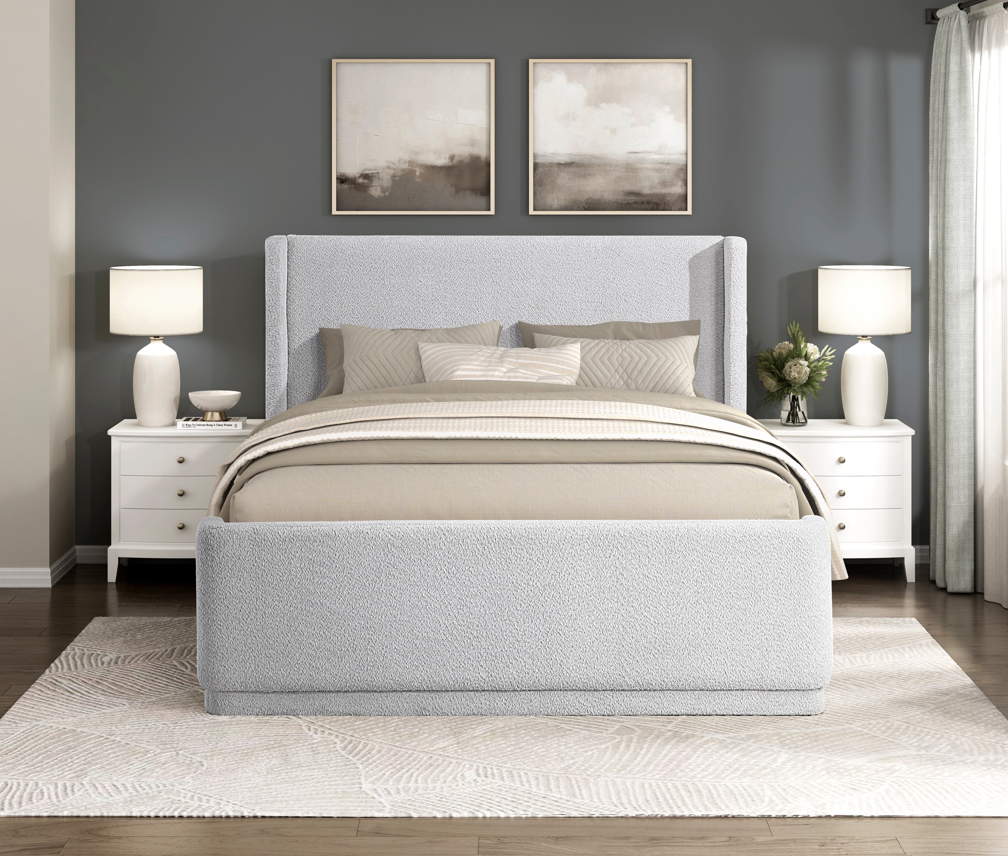Elevate your bedroom's aesthetic with this stylish and practical modern platform bed, designed for both comfort and a contemporary look. Constructed with a durable plywood frame, this bed provides a sturdy foundation for a restful night's sleep. The elegant wingback headboard, upholstered in a beautiful textured fabric, adds a sophisticated focal point to your room. This complete bed set includes the headboard, footboard, slats, and rails, simplifying your setup. Best of all, a foundation or box spring is not required, allowing for a streamlined profile and direct mattress placement. While assembly is required, the sophisticated design and convenient all-in-one package make this bed a perfect choice for a chic and comfortable bedroom.