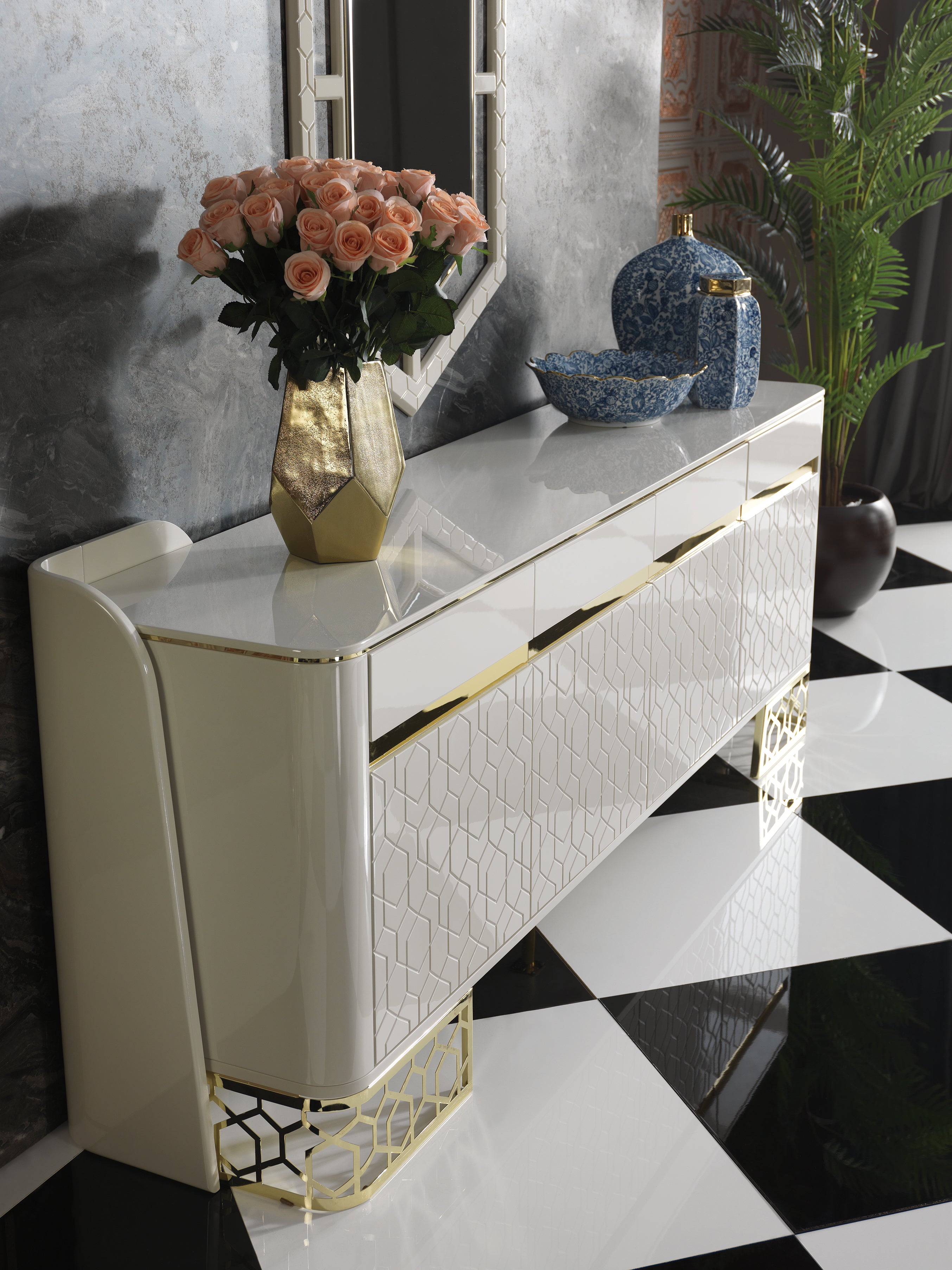 The Ferani Sideboard is an exquisite statement of luxury and functionality, meticulously designed to redefine elegance in your living or dining space. Crafted with an opulent blend of high-gloss finishes, geometric patterns, and gold-accented details, this sideboard embodies sophistication at its finest. A seamless fusion of modern aesthetics and classical refinement, Ferani offers ample storage while serving as a striking centerpiece in any interior setting.