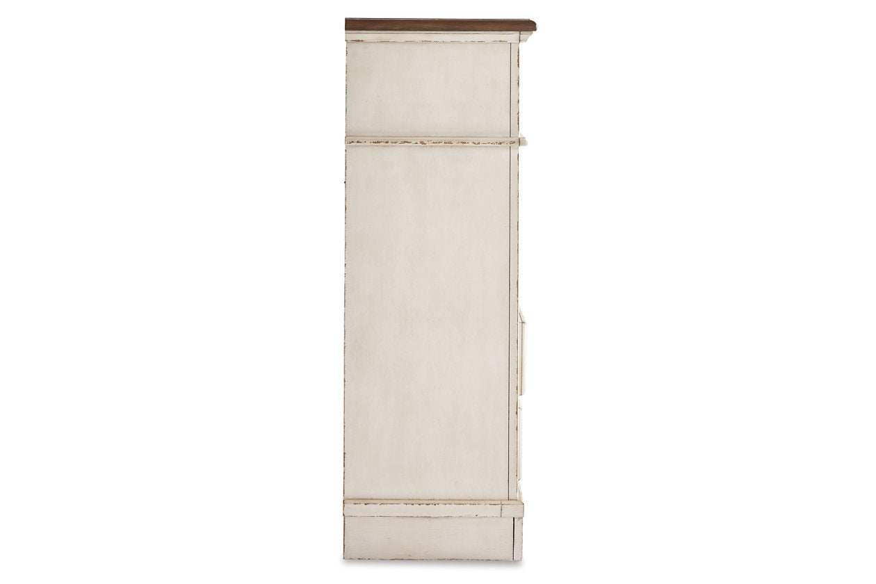 Elevating the art of traditional cottage styling, this chest of drawers is your dream bedroom retreat realized. Antiqued two-tone aesthetic blends a chipped white with a distressed wood finished top for added charm. Framed drawer fronts and decorative corbels add refinement, while bail pulls in a dark bronze-tone finish lend a classic touch. — Luna Furniture introduces Realyn Chest of Drawers to enhance the beauty of your living spaces.